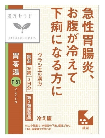 効能:体力中等度で、水様性の下痢、嘔吐があり、口渇、尿量減少を伴うものの次の諸症:食あたり、暑気あたり、冷え腹、急性胃腸炎、腹痛