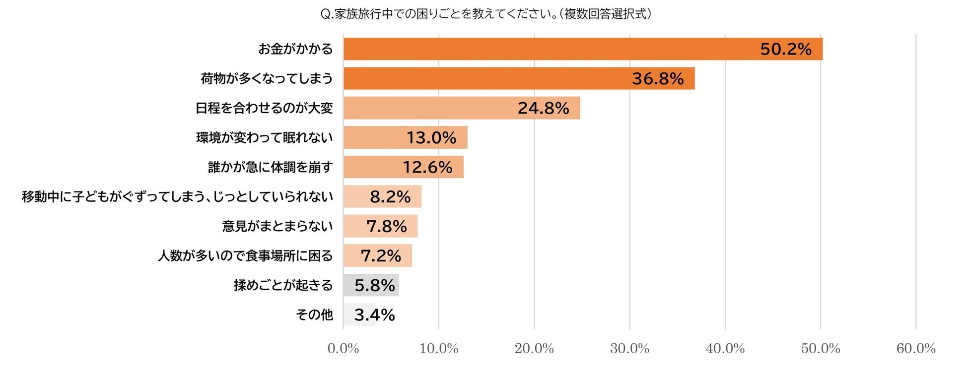 1人での旅行とは違い、人と行動を共にする家族旅行ではさまざまなトラブルが発生することもあります。家族旅行における困りごとを尋ねたところ、2人に1人が「お金がかかる」(50.2%)と回答しており、複数人での旅行では避けられない費用面の不安が目立つ結果となりました。また、お土産の購入などで旅行後の荷物が増える人もいる中で、約4割が「荷物が多くなってしまう」(36.8%)と回答しており、荷物がかさばらない工夫の必要性がうかがえます。その他にも、「環境が変わって眠れない」(13.0%)や「誰かが急に体調を崩す」(12.6%)、「移動中に子供がぐずってしまう、じっとしていられない」(8.2%)と答えた人も一定数おり、家族旅行ならではのトラブルは多岐にわたる傾向が分かります。