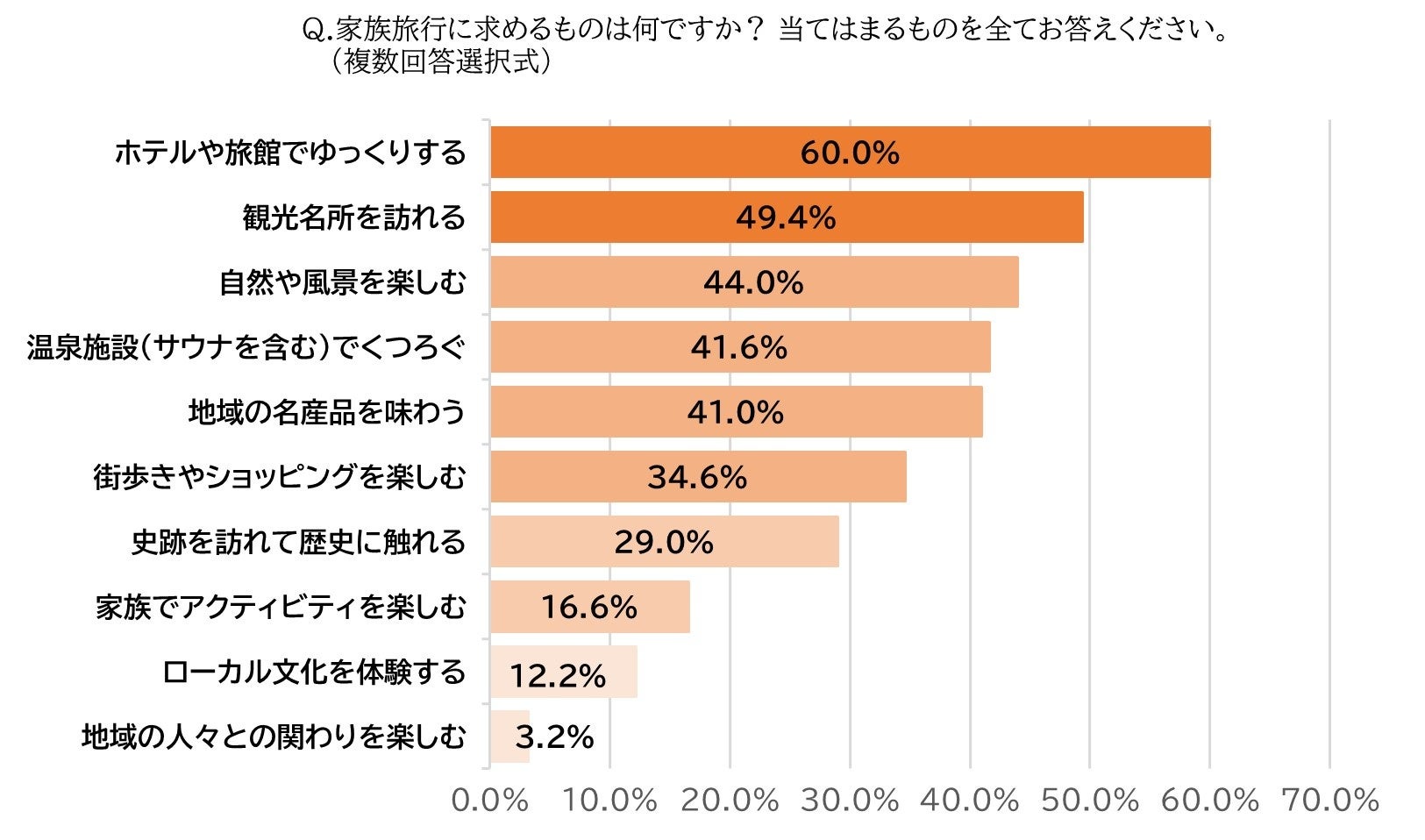 家族旅行はそれぞれスタイルが異なるものですが、本調査(※)では、旅先でもゆっくり過ごしたい“のんびり派”が約7割を占める結果となりました。具体的に家族旅行に求めることを尋ねたところ、「ホテルや旅館でゆっくりする」が60.0%で最も多い回答となりました。また、「温泉施設(サウナを含む)でくつろぐ」も41.6%で上位に入り、家族旅行では屋内施設でゆっくりと時間を過ごすことが好まれる傾向がうかがえます。