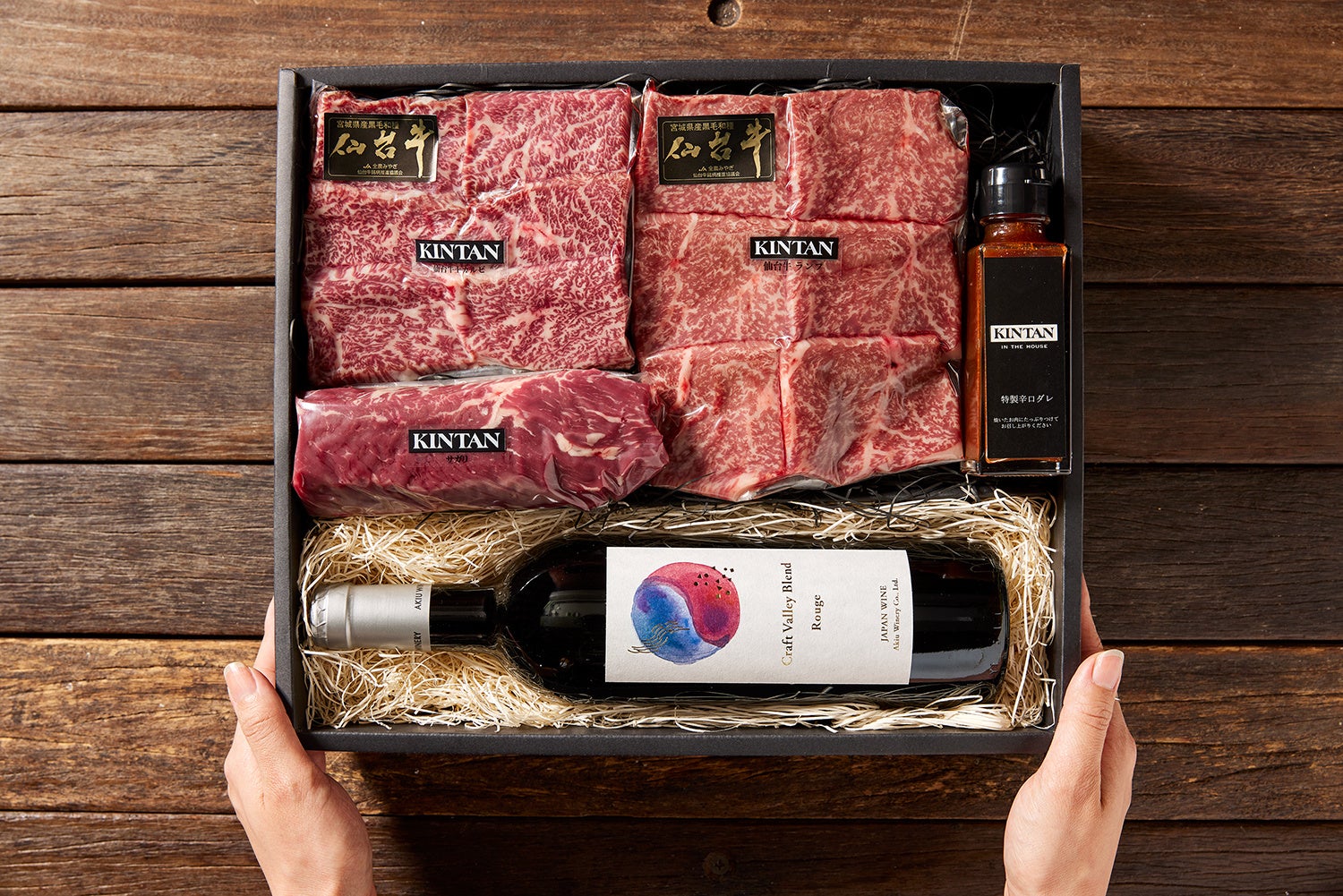 KINTANが自信を持ってお届けする“A5ランク仙台牛”の焼肉とKINTANのソムリエがお肉に合わせてセレクトした宮城県仙台市の秋保ワイナリーの赤ワインを含む全4種からお好みに合わせた1本をお選びいただけるセットは、化粧箱入り・熨斗掛け対応可能なので、お中元など夏のギフトにもおすすめです。