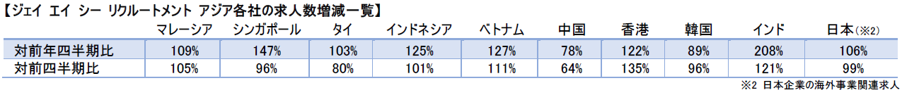* アジア各社の求人数については、アジア各社が意図的に講じた戦略(高額帯年収の求人やスペシャリスト層求人に特化するなど)により、増減する場合もあります。そのため、アジア各社の求人数の増減は、各社の業績を直接反映するものではありません。