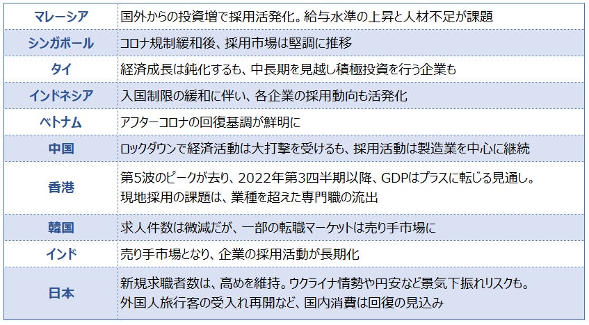 アジア各国のホワイトカラー人材紹介市場動向(2022年4月~6月)コロナ禍による規制の緩和に伴い、アジア全域で経済の回復が本格化