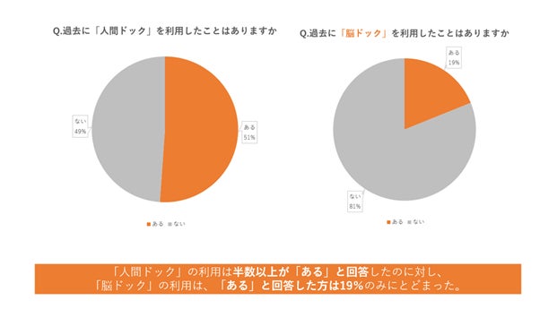 本特典に申し込みをいただいた方のうち、任意で記載を依頼したアンケート結果を集計し属性調査を行いました。その中で、人間ドックの経験の有無の設問に対しては、回答者の半数以上の方が「ある」と回答しました。一方で、脳ドックの経験の有無の設問に対しては、「ある」と回答した人は約19%のみという結果となりました。
