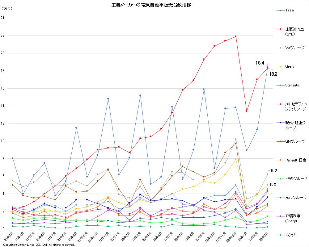 3月は、中国での販売台数を大幅に増やしたTeslaがBYDを抜き2022年6月以来の首位。2位は0.1万台の差でBYD、3位にVWグループが続いている。ここでもTeslaの大幅な値下げの影響力が現れる形となった。