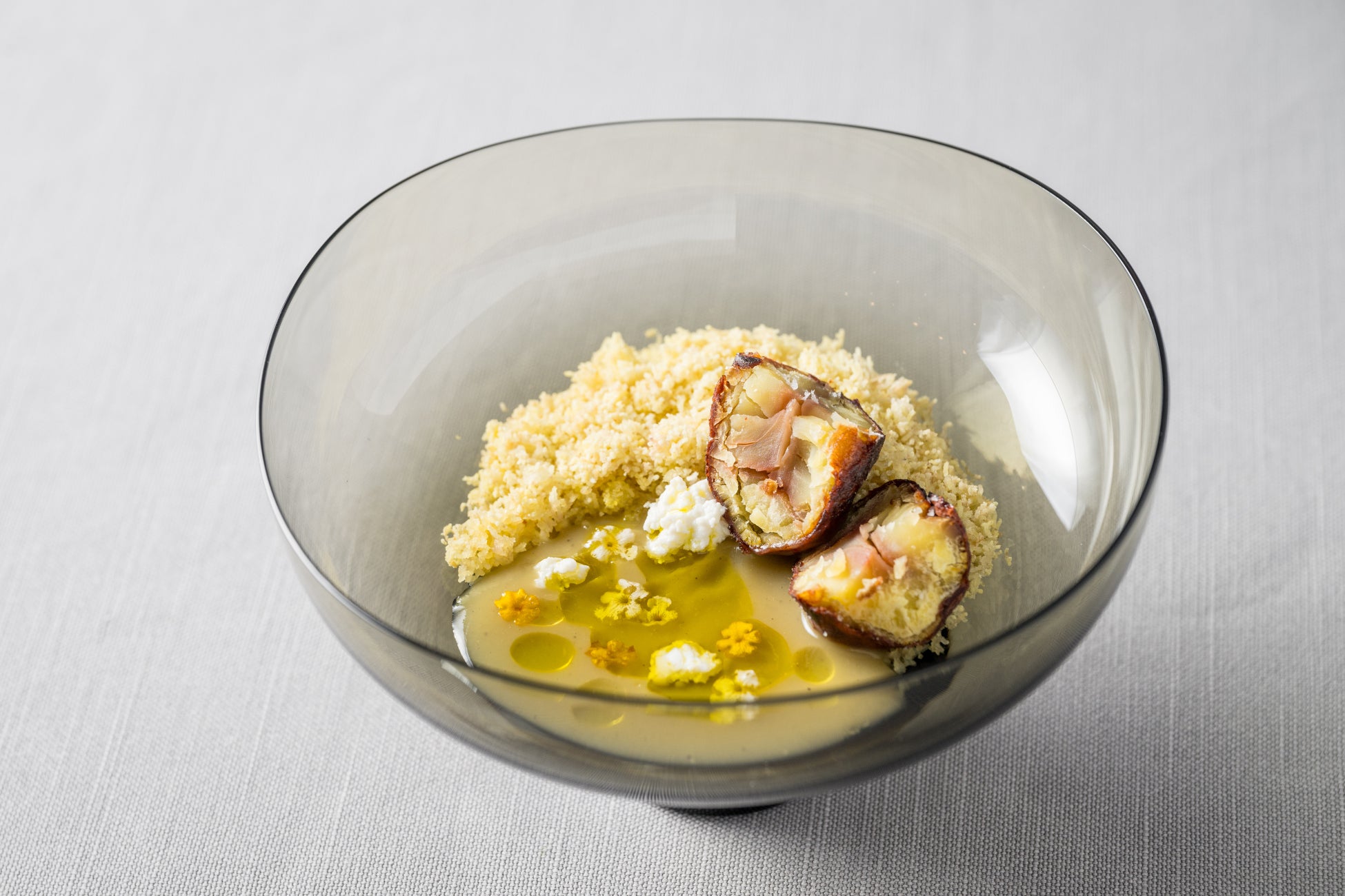 笠間の栗ペーストをブロード(出汁)とオリーブオイルで整えたスープに、蒸して裏ごしをした栗のパウダー、素揚げして軽く塩を振った栗、リコッタチーズを和え、濃厚な味わいで和栗の風味が口いっぱいに広がります。栗をそのまま食べる以上に、スープという濃縮した”栗”を食べているような感覚になる一品です。
