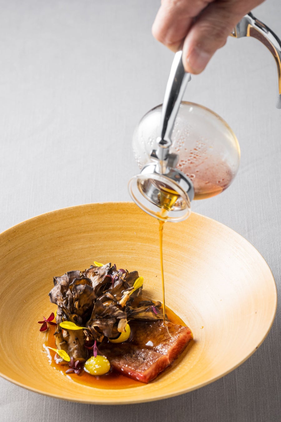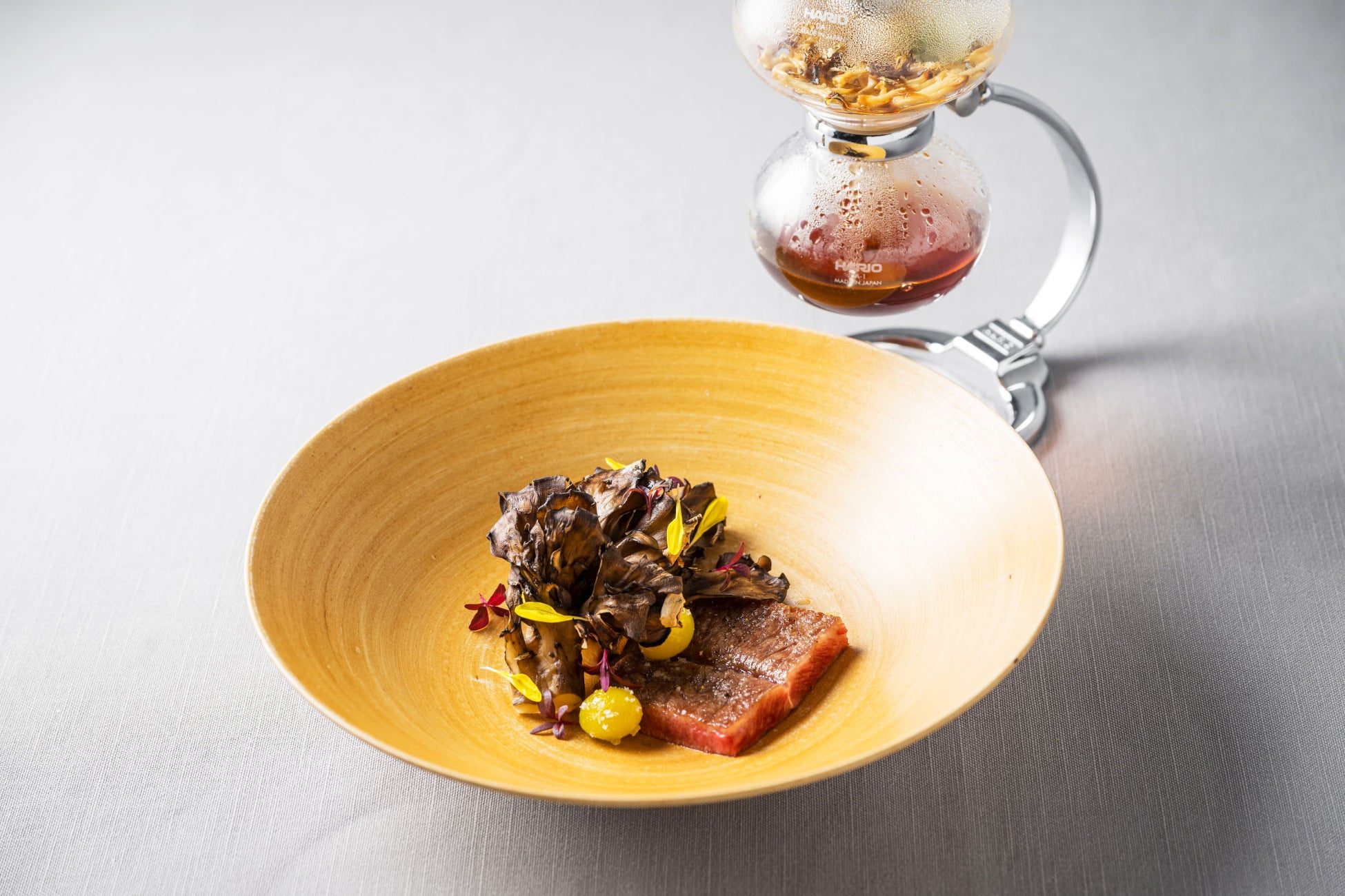 炭火で炙った香ばしい常陸牛のミスジに、秋の訪れを印象づける舞茸、銀杏をあしらいました。サイフォンで沸騰させた濃縮コンソメスープには、乾燥させた舞茸、ローリエ、黒胡椒に蒸気をくぐらせ、芳醇な香りをまとわせています。あっさりと、かつ凝縮された常陸牛の旨みを味わうことができます。