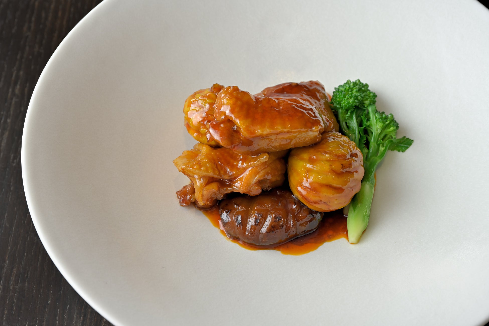 180℃で焼き上げた笠間栗、ねぎ、天白干椎茸、地鶏のもも肉を、紹興酒やごま油、ラー油、醤油等で作った特製ソースで甘辛く絡め煮ました。ほっくりと甘い笠間栗と、肉厚でジューシーな鶏もも肉や椎茸は旨味、食べ応え抜群。芳香な紹興酒の余韻も食欲をそそります。