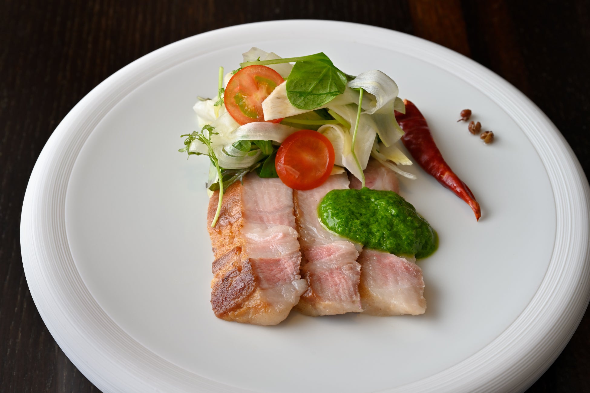 常陸の輝きロース肉の低温調理椒麻ソース添え(油浸軟輝豚肉)