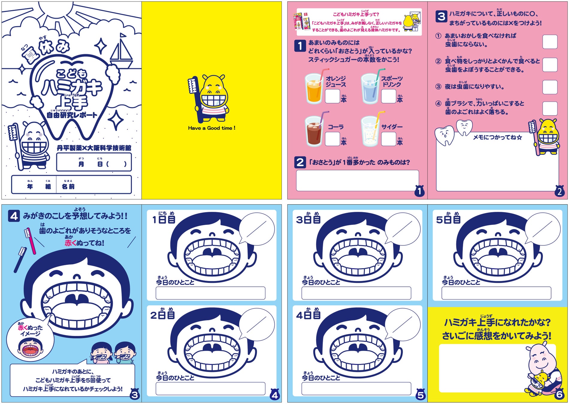 大阪科学技術館来館の親子を対象に、「夏休みの自由研究」をテーマにハミガキイベントを実施しました。夏休みに行うイベントということで、夏休みの自由研究としても使うことができるオリジナルレポートをプレゼントし、イベントの中でも活用しました。さらに、ひとりできちんと歯を磨くことができる「こどもハミガキ上手」を参加者の方にプレゼントをしました。「こどもハミガキ上手」を使っていただき、ハミガキが上手になっているかレポートに変化を記録することができます。