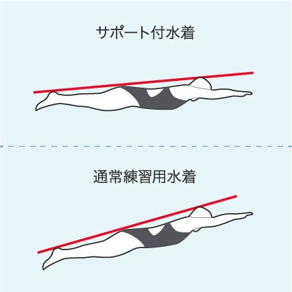 ウエットスーツなどにも使われる「クロロプレンゴム」という浮力のある素材を使用しています。サポート付き水着と通常の練習用水着を着て水中姿勢を比較したところ、下半身の位置に差が出ました。サポート付き水着を着用した場合は、腰の位置が高く、頭からかかとまでが水面と平行に近くなります。
