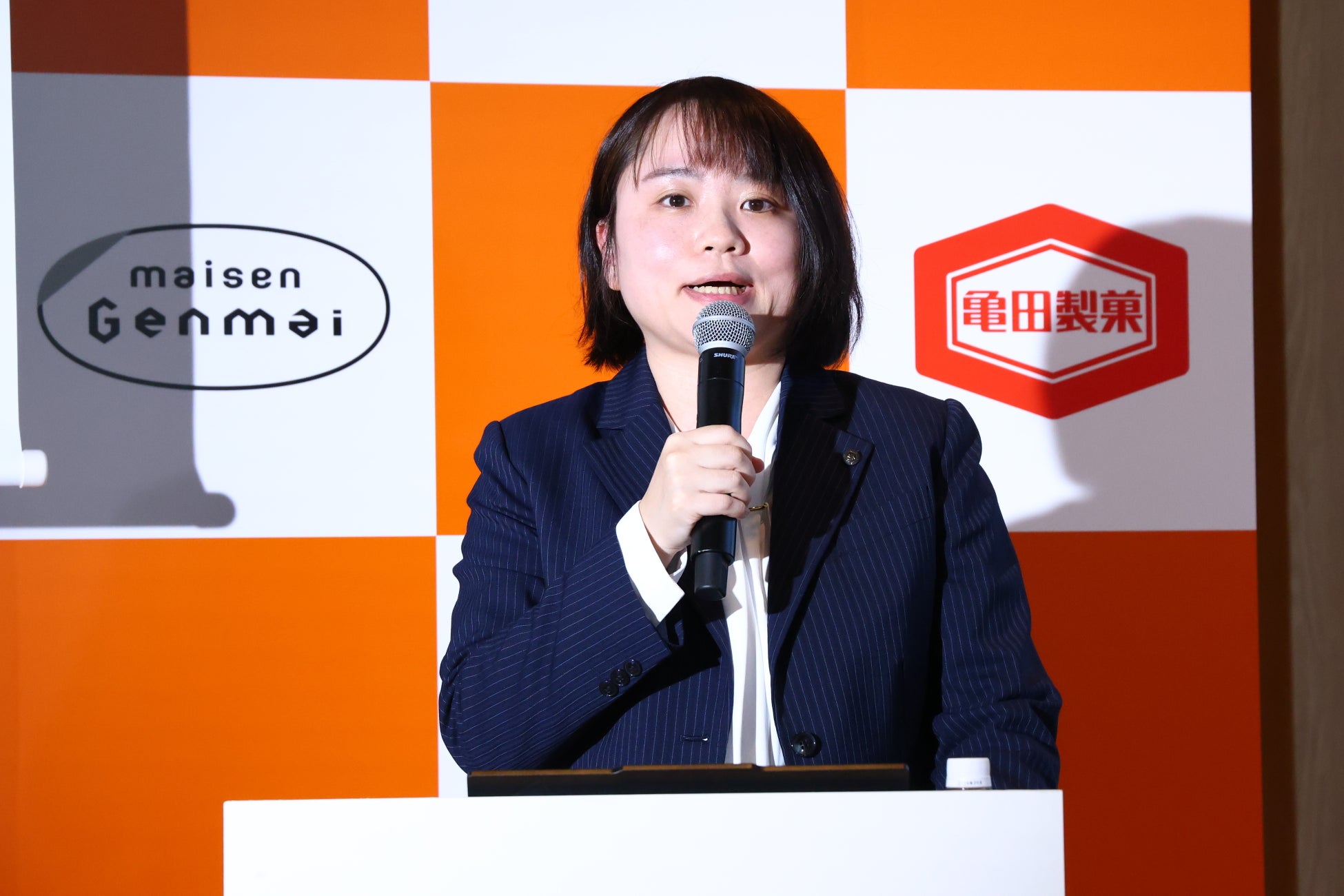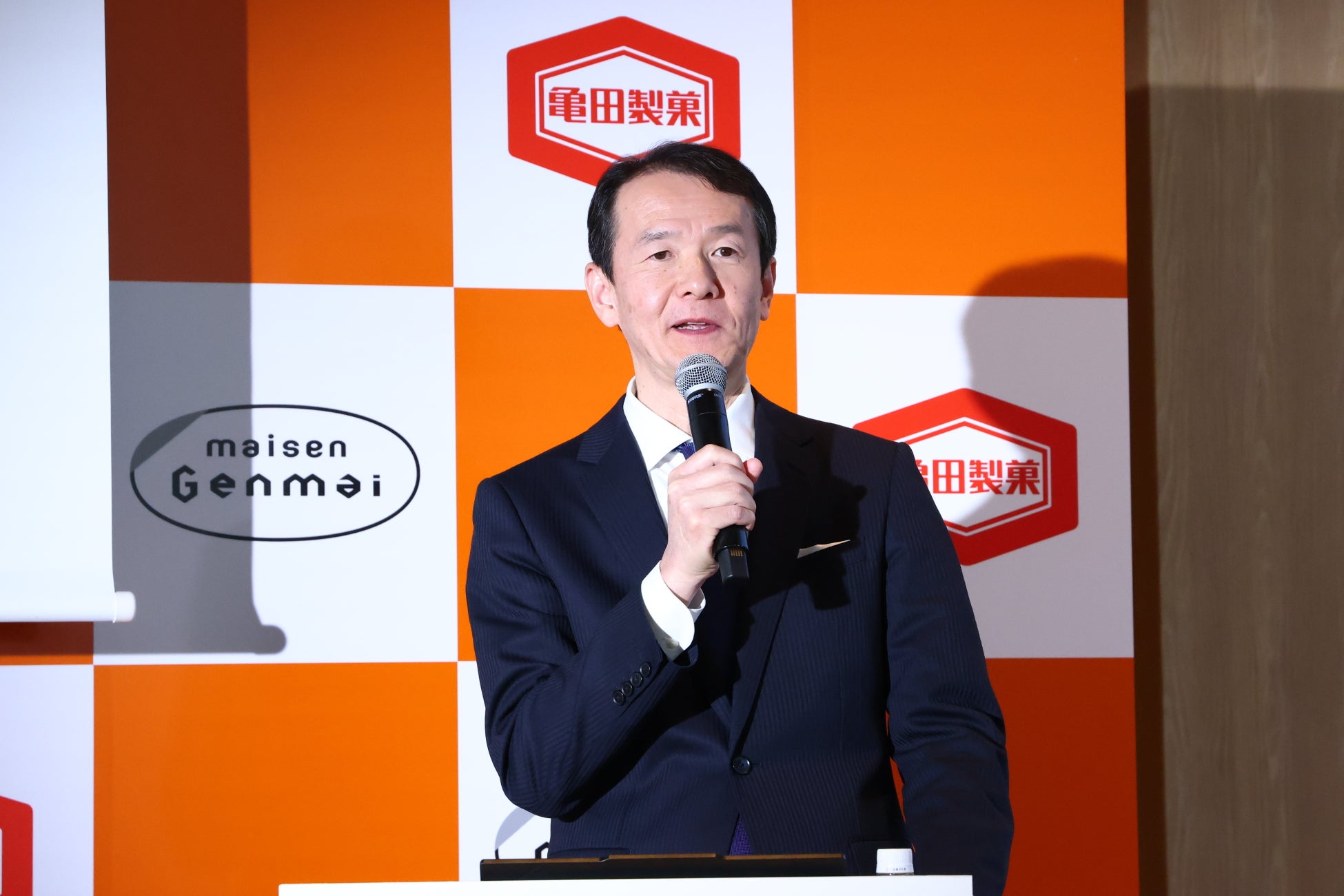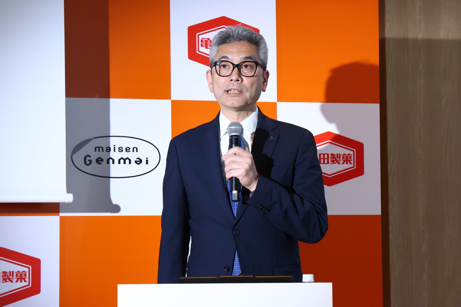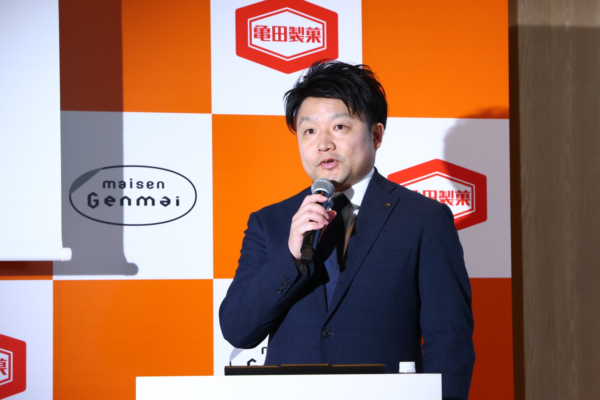 発表会冒頭に登壇した、亀田製菓の常務執行役員 古澤 紳一は、ライスイノベーションカンパニーとして、米業で培った技術を活用した大豆商品の新規性について説明。「お米と大豆は親和性が高く、また、当社の植物性乳酸菌K-1はこれまで高い評価を受けております。乳酸菌を配合した米菓と大豆ミートを是非お試しください」と述べました。