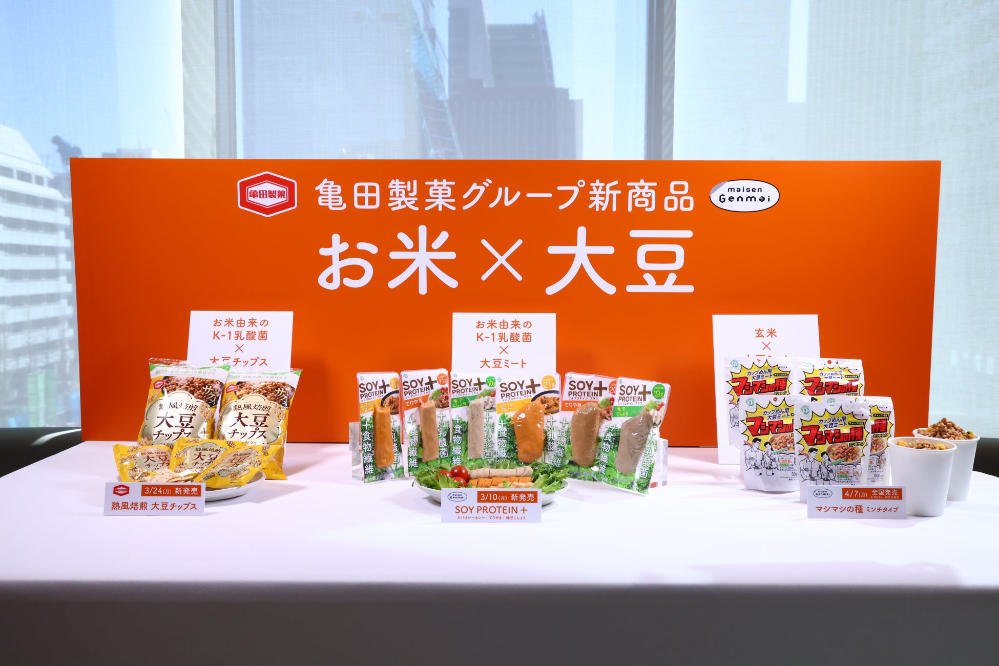 亀田製菓グループでは、お米の可能性を最大限引き出し、世界で新価値・新市場を創造する“ライスイノベーションカンパニー”をビジョンとして掲げ、お米を軸とした多種多様な商品を提供しています。このたび、亀田製菓が創業以来培ってきたお米の研究開発力と加工技術力を“大豆”にも活かした新商品3品を亀田製菓および亀田製菓のグループ会社である株式会社マイセンファインフードから順次発売します。