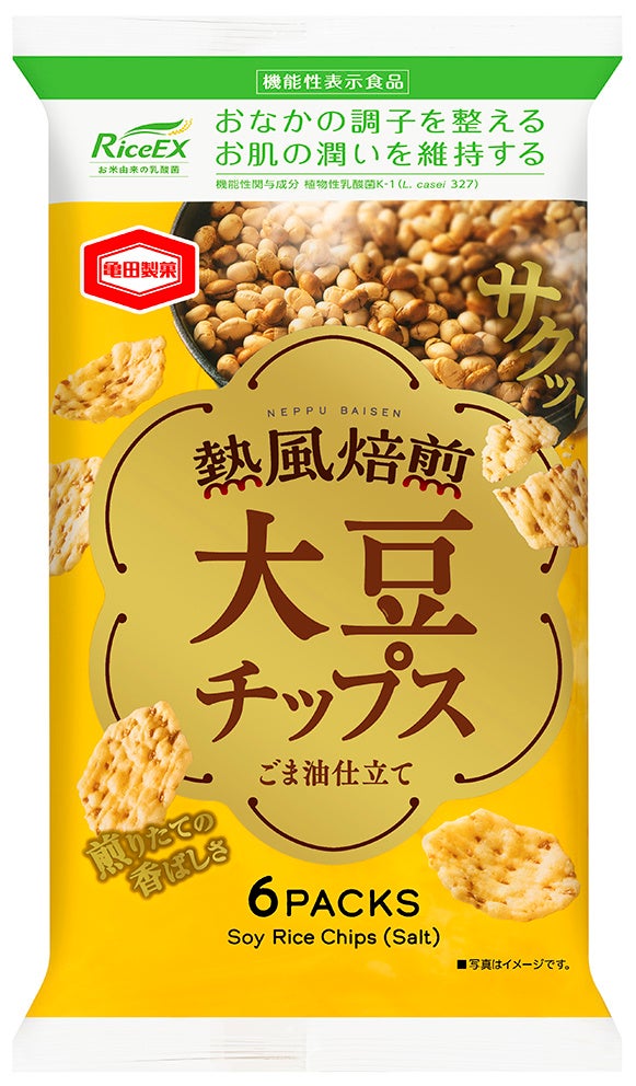 亀田製菓株式会社(本社:新潟県新潟市、代表取締役社長 COO:髙木 政紀)は、お米由来の植物性乳酸菌K-1を配合し、「おなかの調子を整える」機能と「お肌の潤いを維持する」機能を表示した機能性表示食品、『54g 熱風焙煎 大豆チップス』(以下:『熱風焙煎 大豆チップス』)を、2025年3月24日(月)より全国にて新発売します。