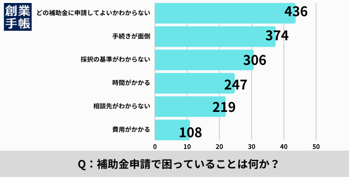補助金の活用を検討する経営者において、補助金申請で困っていることは何かと質問をしてみたところ、「どの補助金に申請してよいかわからない」という回答が436件で、全体の約7割を占める結果となりました。