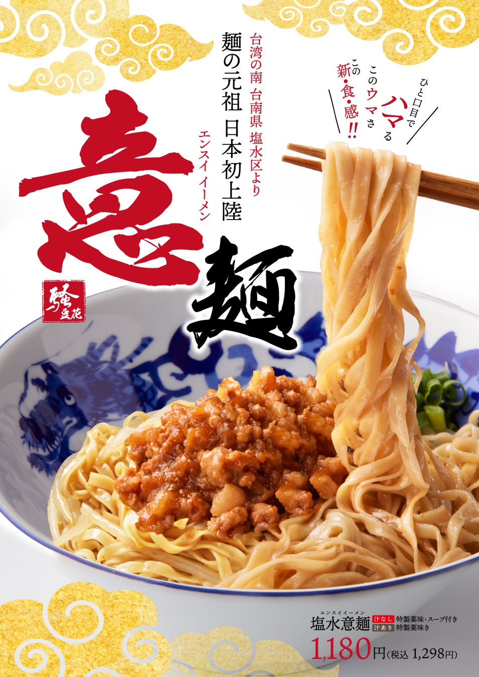日本初上陸※ の塩水意麺は、台湾南部の古都、台南県塩水地区が発祥の300年以上の歴史を持つと言われる伝統麺です。