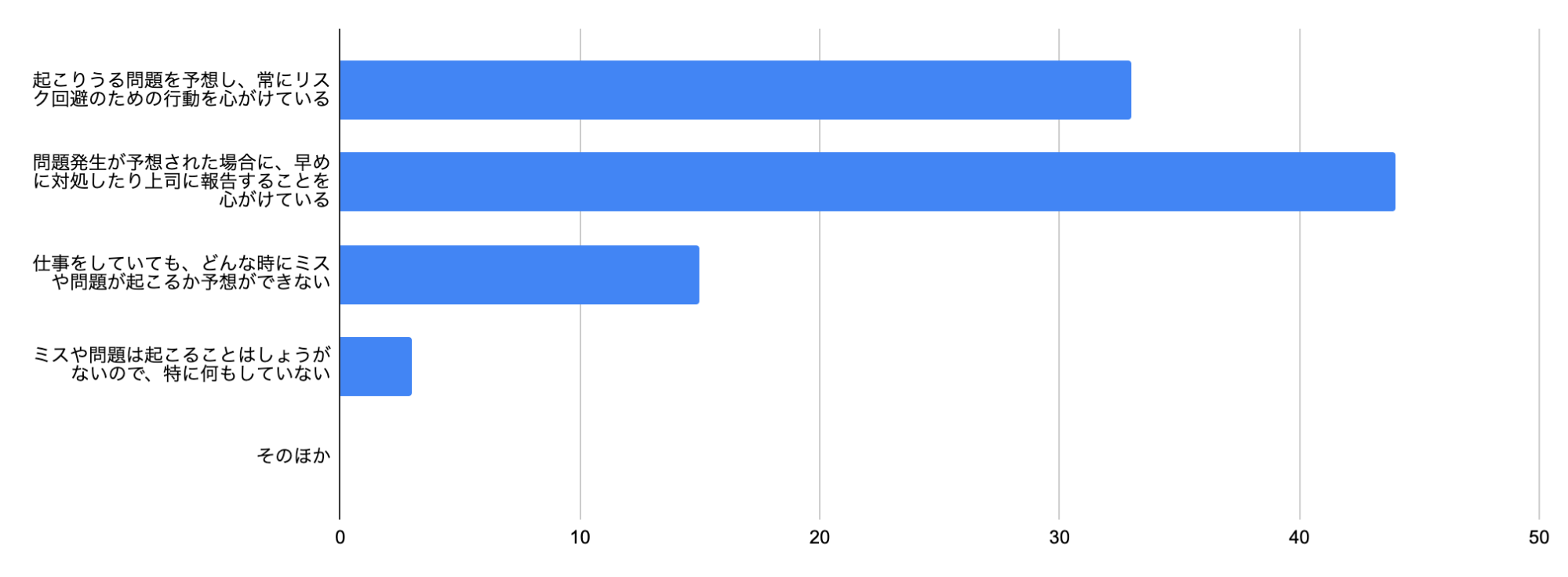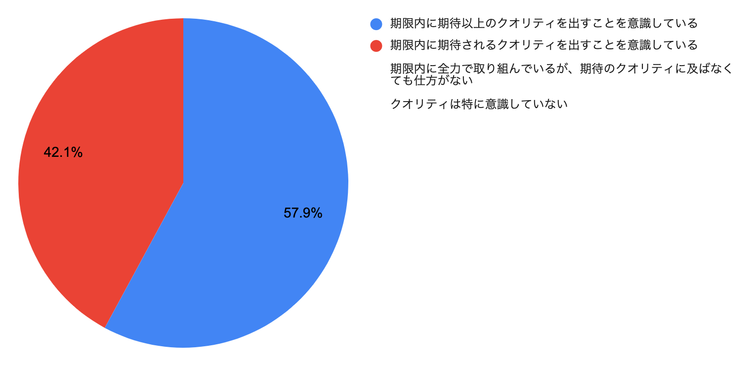 結果からは、スケジュールや納期に対して、強い意識を持っていることが伺えます。また、すべてのエンジニアが最低限求められているクオリティを心掛け、半数以上は“期待を超えよう”という姿勢で取り組んでいることがわかりました。スピードとクオリティの両立を意識しているといえるでしょう。