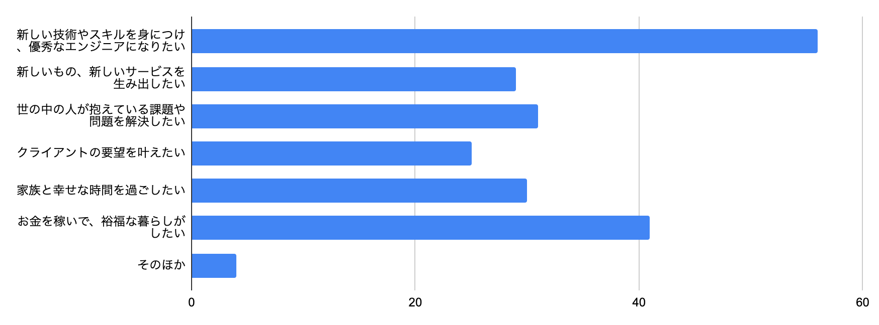 一般的にフィリピンやベトナムの人たちは、「家族と過ごす時間を、仕事と同じぐらい大切にする」傾向があると言われています。今回のアンケート結果においてもその傾向は見られるものの、回答者の約98%が「新しい技術やスキルを身につけ、優秀なエンジニアになりたい」という意識を持っていることがわかりました。自身のスキルアップ・キャリアアップの思考が強いようです。
