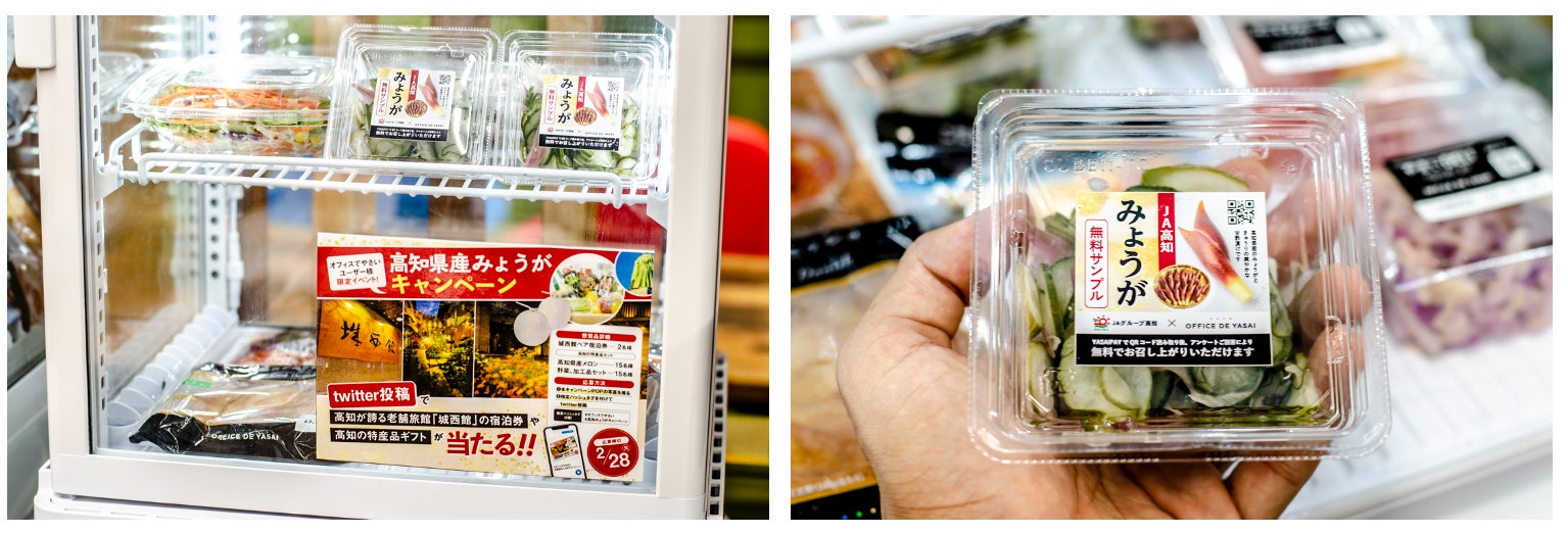 今回は「みょうが」の消費が少ないエリアにおいて実食いただく機会を作るため、その場で簡単に食べられるよう高知県産の「みょうが」をきゅうりと合わせ甘酢漬けにした小分けカップを準備し、オフィスに設置した冷蔵庫にてサンプリングを実施いたしました。