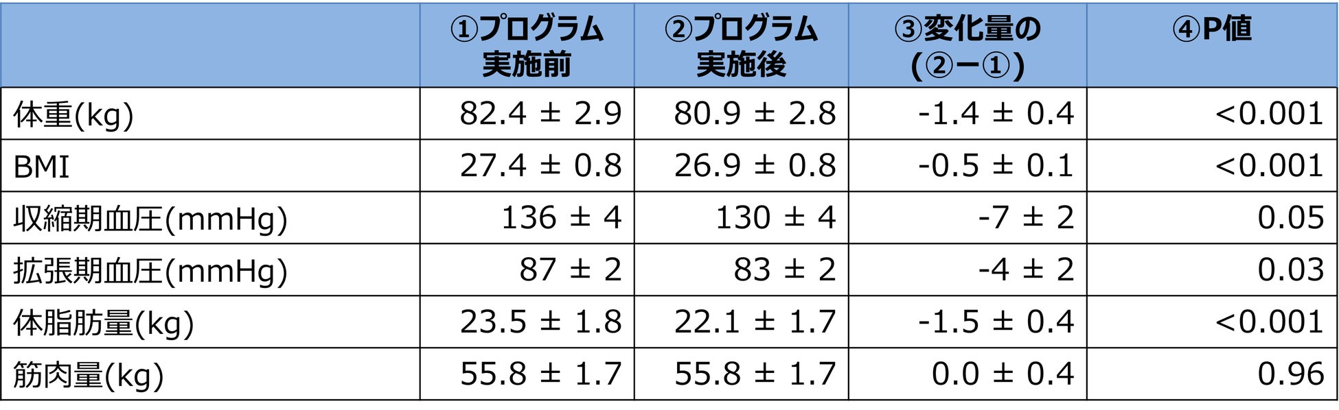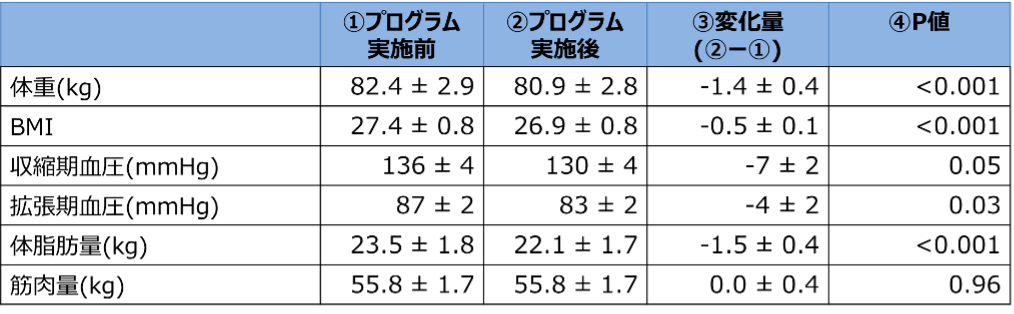 グラム開始前後の身体測定を実施できた17名の参加者において、体重・BMI・血圧・体脂肪量の有意な減少と、筋肉量の維持を認めました。さらに食生活においても、脂肪や塩分摂取量の有意な減少と、肥満につながる食行動の改善を認めました。