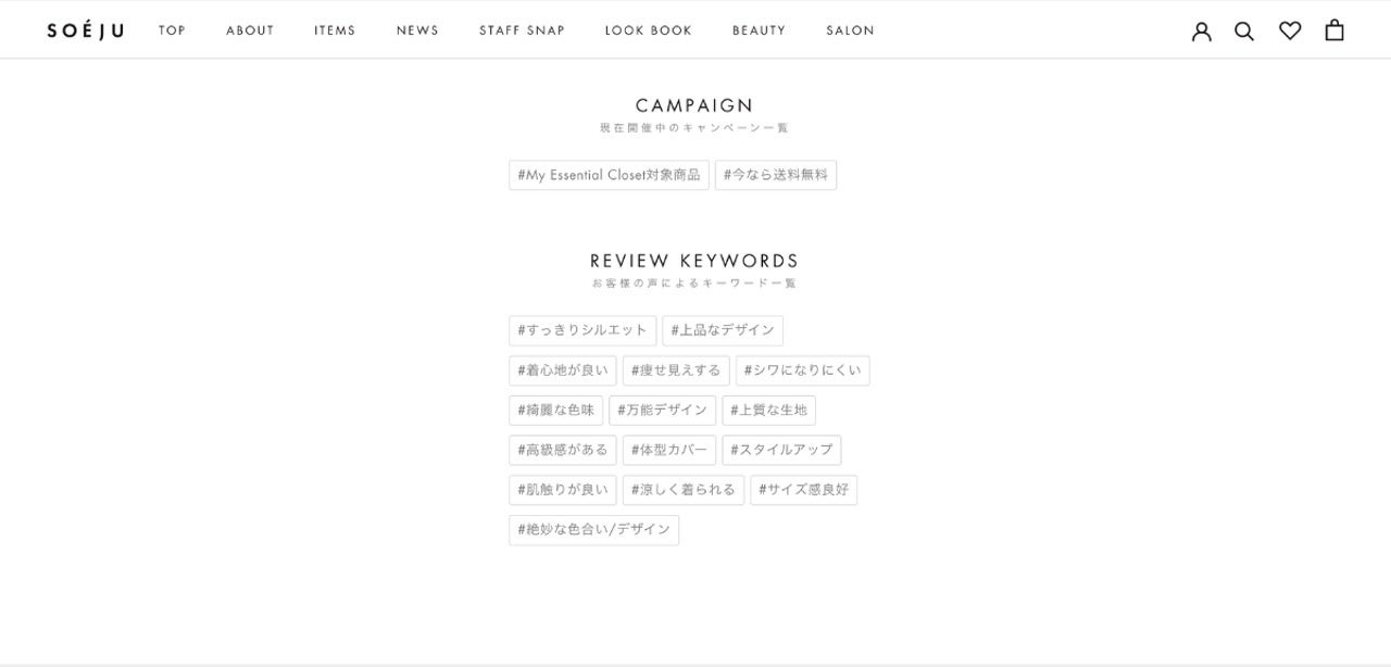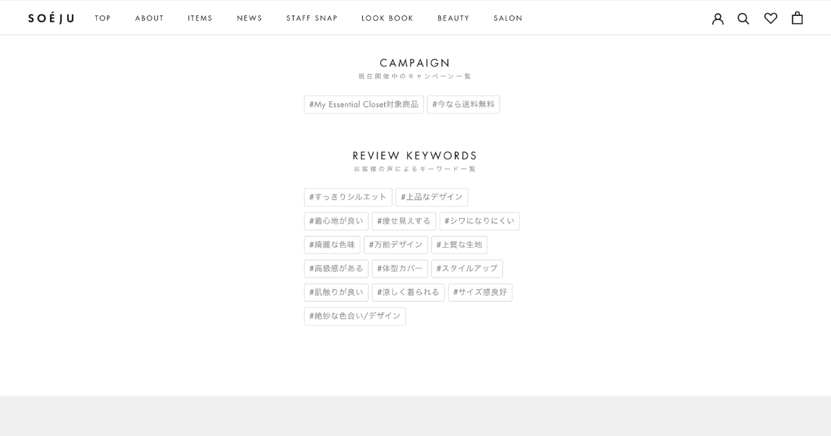 「SOÉJU」は、これまでもお客様からのレビューや販売データ等の解析により、お客様のニーズを反映した商品展開やサービス開発を行ってまいりました。その中で、商品購入検討時に「シワになりにくい」「体型カバーができる」「着心地が良い」などのニーズの高いキーワードが多いことから、今回「SOÉJU」オンラインストアにて、ChatGPTのテキストからより洗練されたインサイトを抽出できるGPT-4の特徴を活用して商品レビューデータを解析、商品レビューから「訴求フレーズ」を抽出する機能をリリースいたしました。これによりお客様の声に基づいたリアルな評価や特徴を一目で捉えることができ、類似する特徴を持つ商品の検索ができるようになりました。