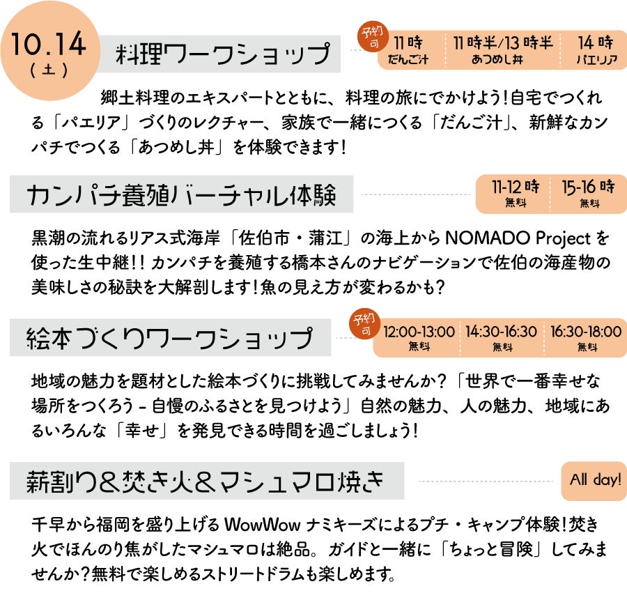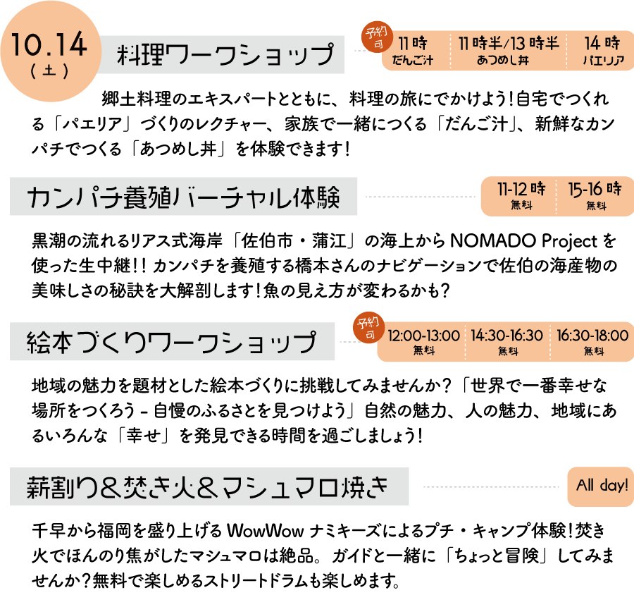 大分の3つの場所(佐伯市・中津市・竹田市)を題材にしながら、「おいしい」をテーマにした絵本づくりワークショップを行います。親子でご参加ください。(10/14のみ)