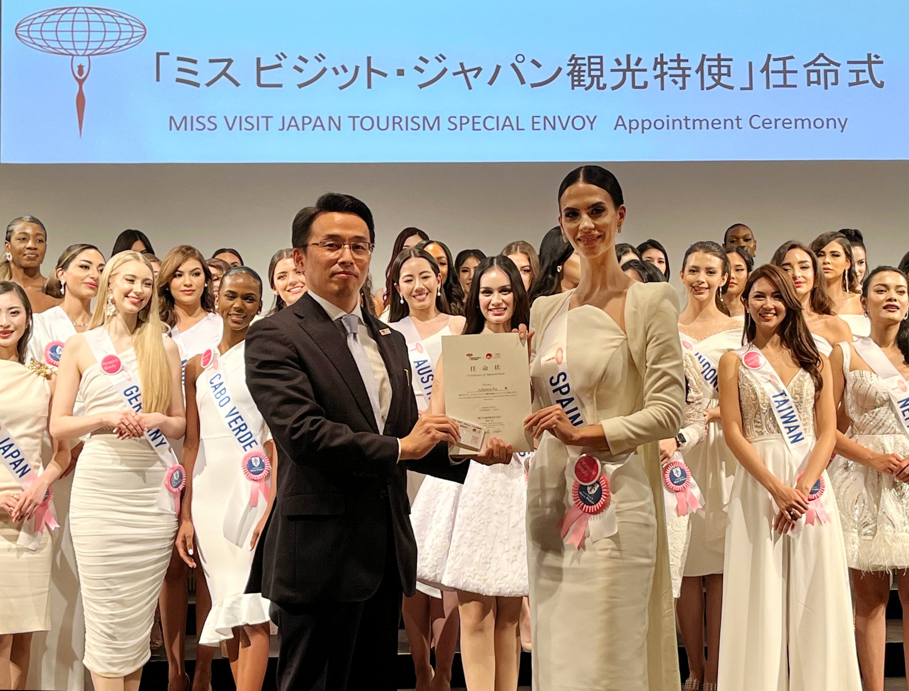 「コロナ禍で世界の旅行者は激減していましたが、我が国も10月11日からコロナ対策の水際対策を緩和し、ビザなし渡航、個人旅行の受け入れを再開し、多くの方の訪日をお待ちしております。皆様には、本日から『ミスビジット・ジャパン観光特使』として、世界中に日本のファンを増やしていくお手伝いをしていただきますようお願いします。これから半月ほどの滞在で、ぜひ日本を満喫していただき、滞在中に体験した驚きや感動を皆様のすばらしい笑顔とともに我が国の魅力として世界に発信していただければと思います。」