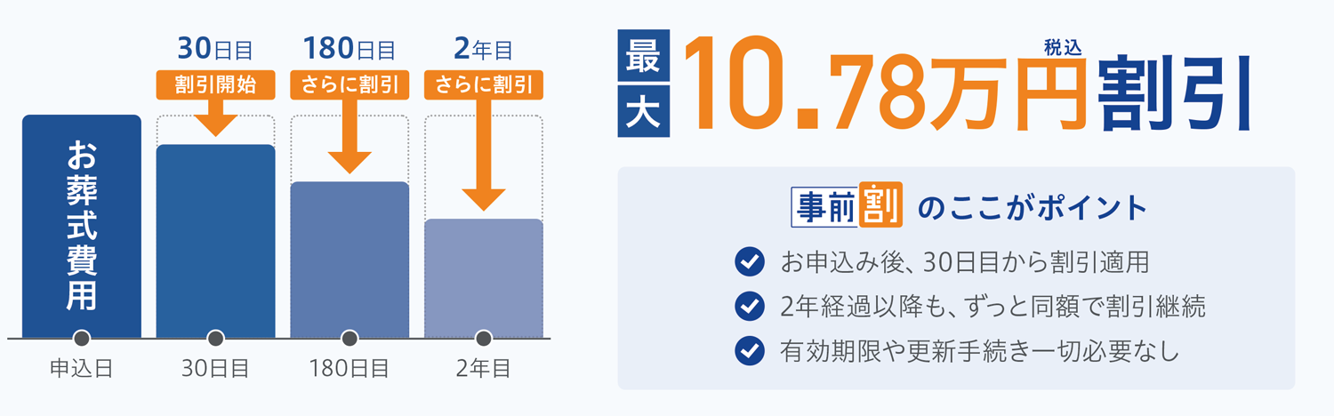 2022年1月31日(月)正午以降、「よりそうお葬式・事前割」にお申し込みいただき、お葬式当日までの期間が30日以上経過すれば割引が適用されます。さらに、お葬式施行までの期間が180日、2年と長くなればなるほど割引額が大きくなっていきます。