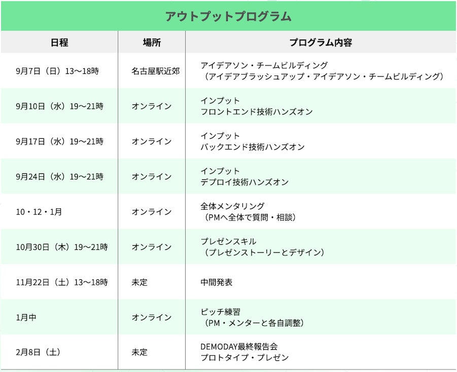 インプットプログラム最後のセレクションにて6チームを選抜します。その後、アウトプットプログラムでは最初に事業アイデアのブラッシュアップを行い、開発を進めていただきます。アウトプットプログラムに進んだ選抜チームには開発支援金最大40万円/チームを上限に支援します。