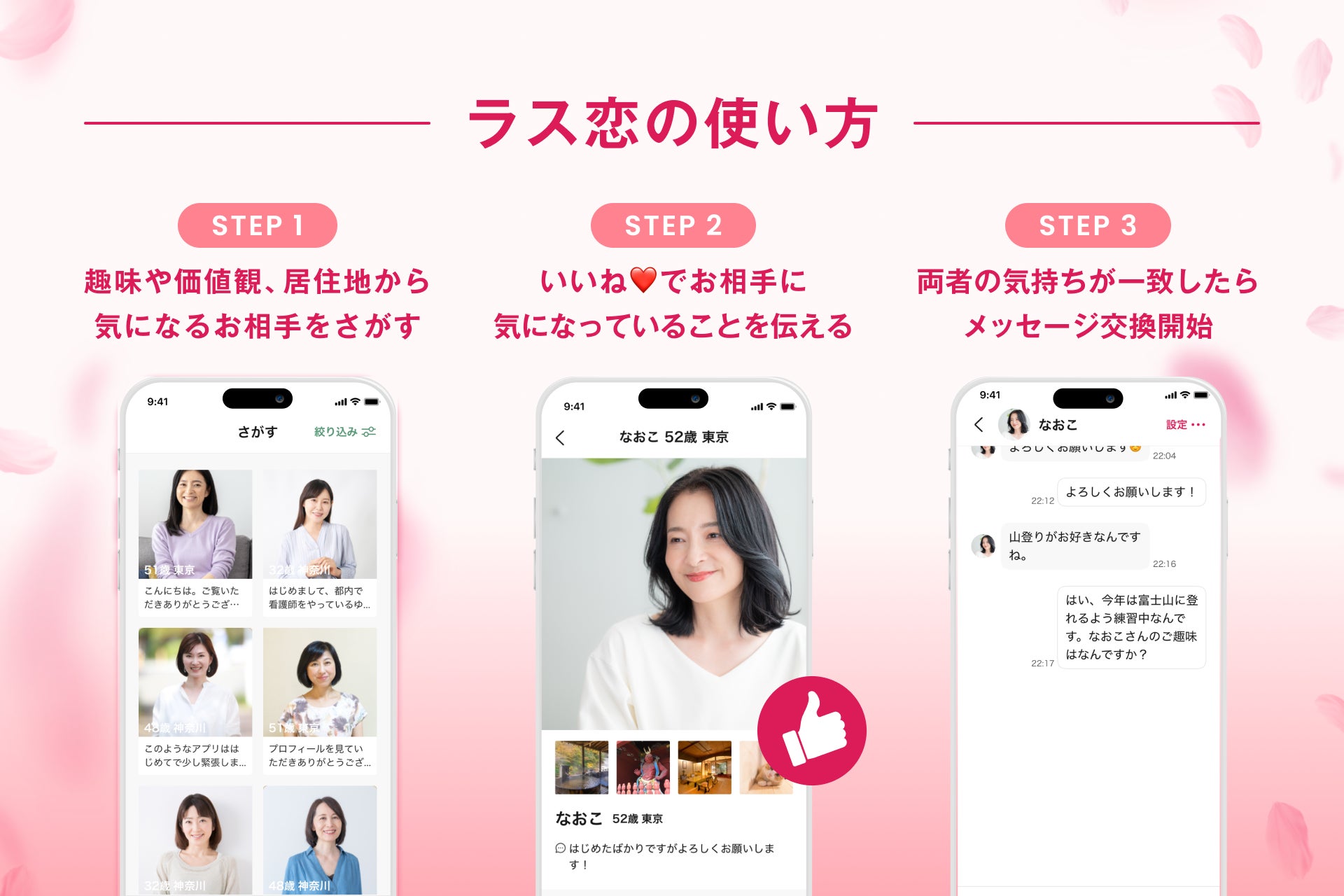 アイザック株式会社(本社:東京渋谷区、代表取締役社長 田中 和希)は、対象年齢が40歳以上の恋活・婚活マッチングアプリ「ラス恋」の提供を開始しました。