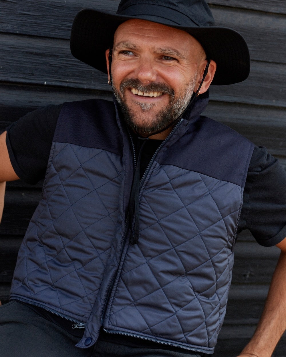 カスタマイズ可能なジレは、ネイビーツイルのパネルと、リサイクル・ポリエステル100%のラブンスター生地を2インチダイヤモンドでキルティングした両方の生地を合わせています。