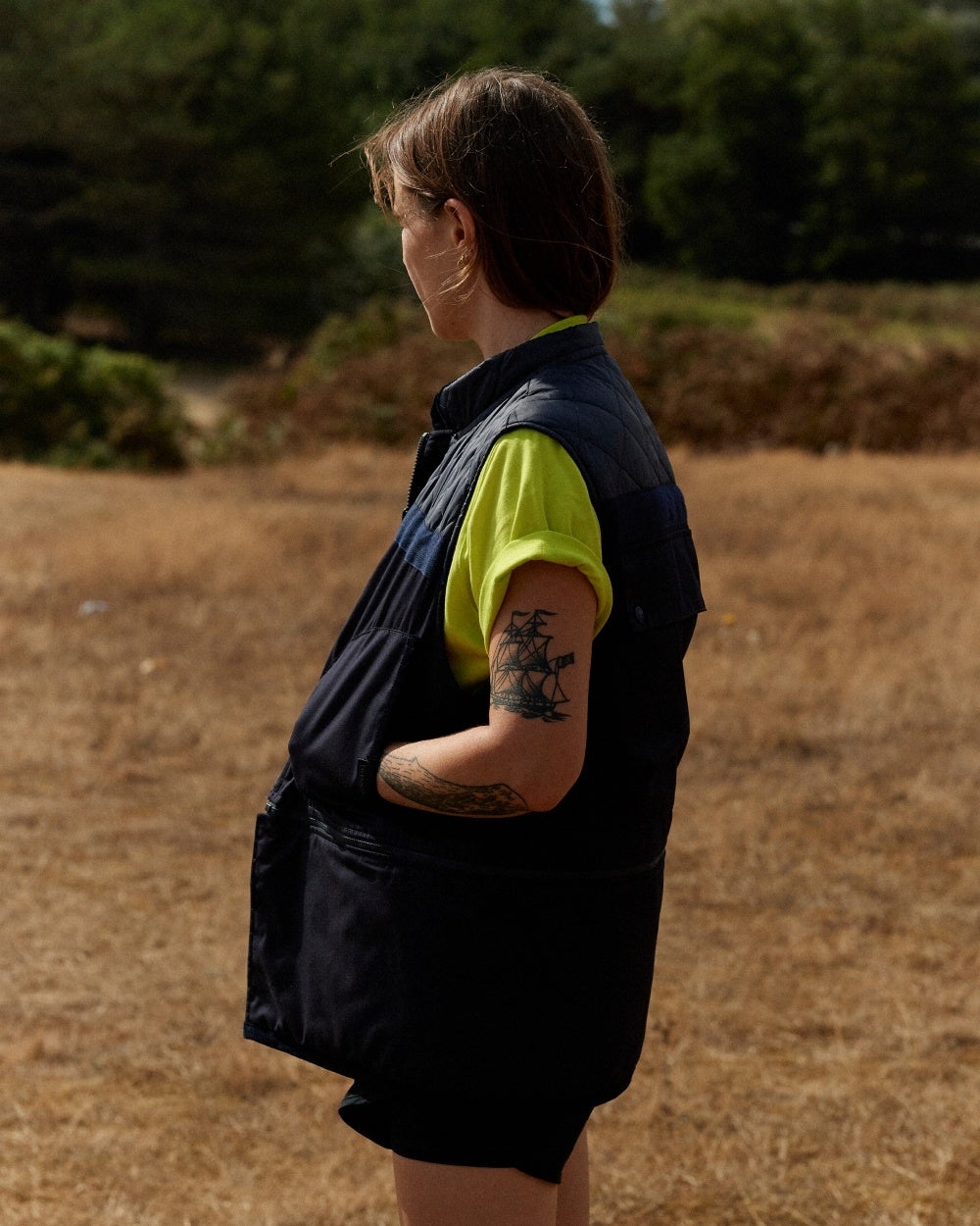 背中には大きなフラップポケットがあり、16通りの着こなしができるこのジレの未使用パーツを収納できます。