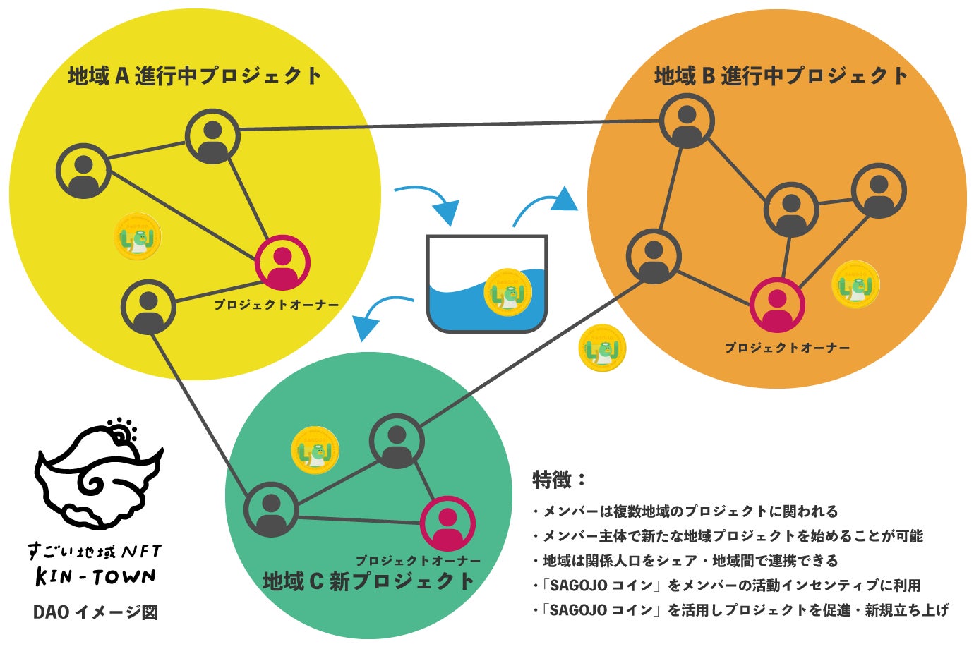 「KIN-TOWN」追加販売の決定とあわせ、SAGOJOは、NFTを活用し、貨幣経済の原理では従来困難だった人口減少地域の新たな経済循環と関係人口拡大の成功モデルを構築し、その輪を広げていくことを目的とするDAOコミュニティ「KIN-TOWN DAO」を始動します。「KIN-TOWN DAO」の参加メンバーは複数の地域横断でNFTプロジェクトに関する知見を深めることができること、参加地域は関係人口をシェアすることができることを特徴とします。
