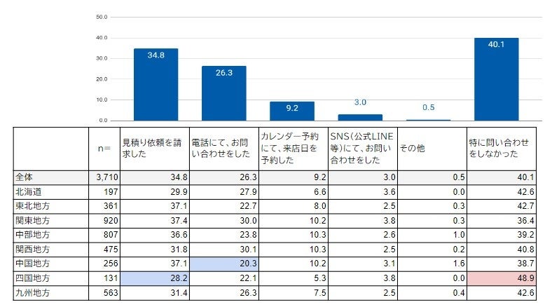 地方別にみると、「四国」で「特に問い合わせをしなかった」49%で最も高い。