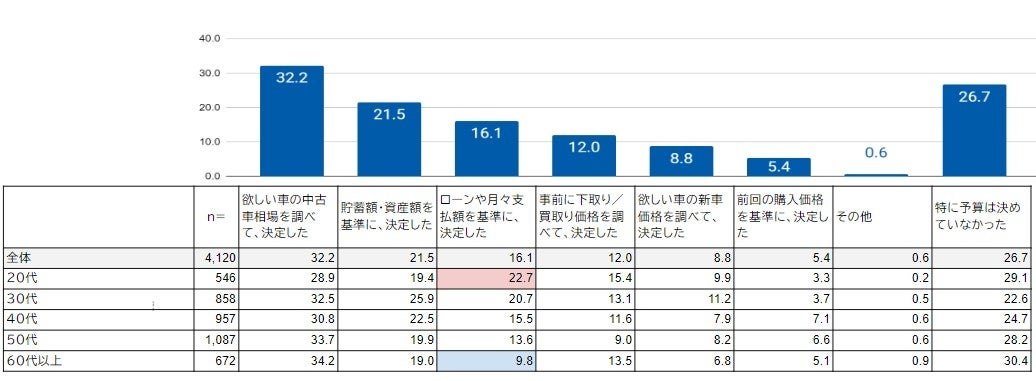 予算決定時の行動は、「欲しい中古車の相場を調べて、決定した」がトップ。次いで、「貯蓄額・資産額」「ローンや月々支払額」と続く。