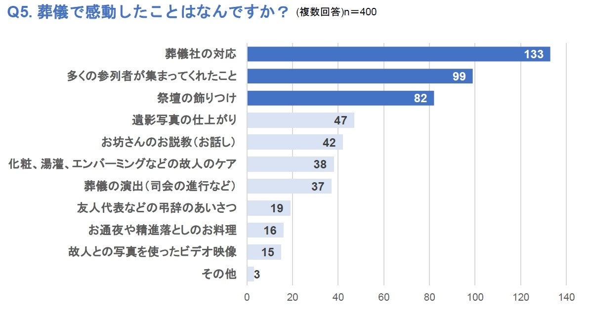 葬儀をおこなうにあたり葬儀社は、喪主やご遺族の目線になって提案、相談を受けることが重要であり、その姿勢から感動したことに「葬儀社の対応」が入ったのではないかと考えられます。