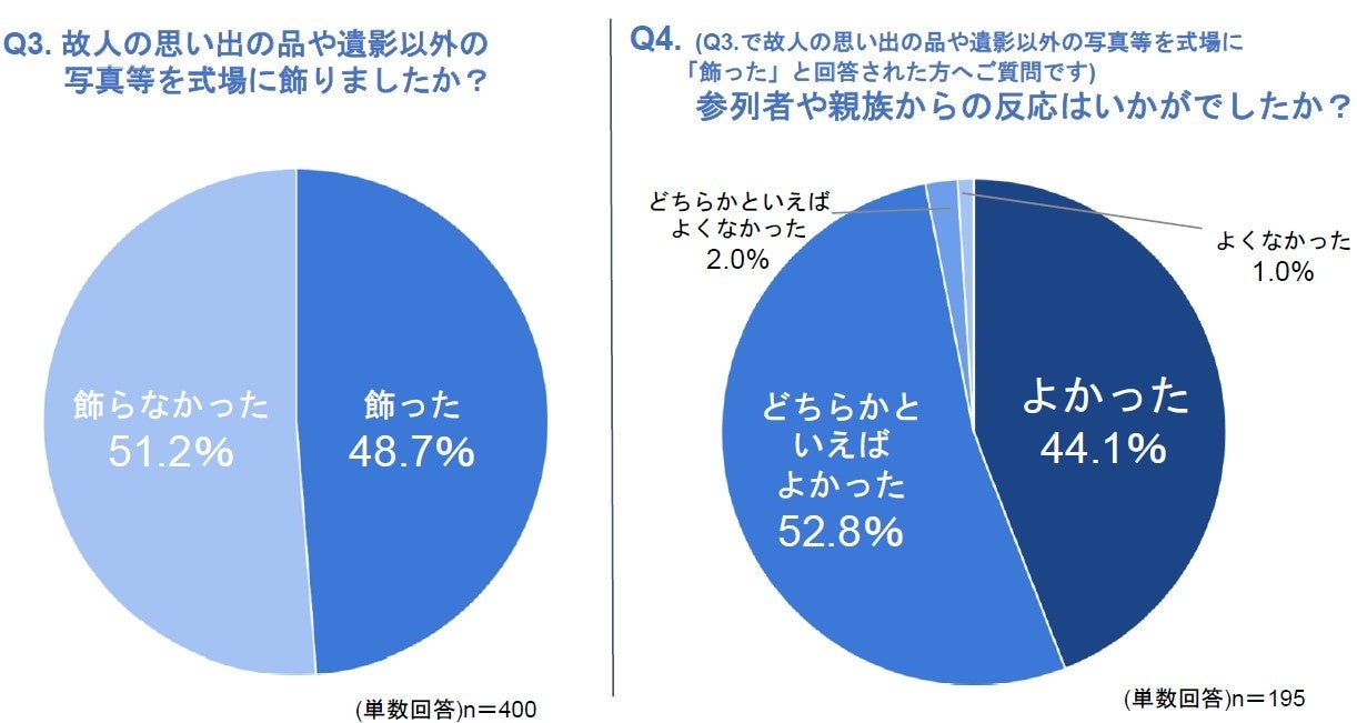 - 意外にも式場に個人の思い出の品や遺影以外の写真等を飾った人は半数に満たず。一方で飾った人は葬儀自体の満足度が高い傾向に
