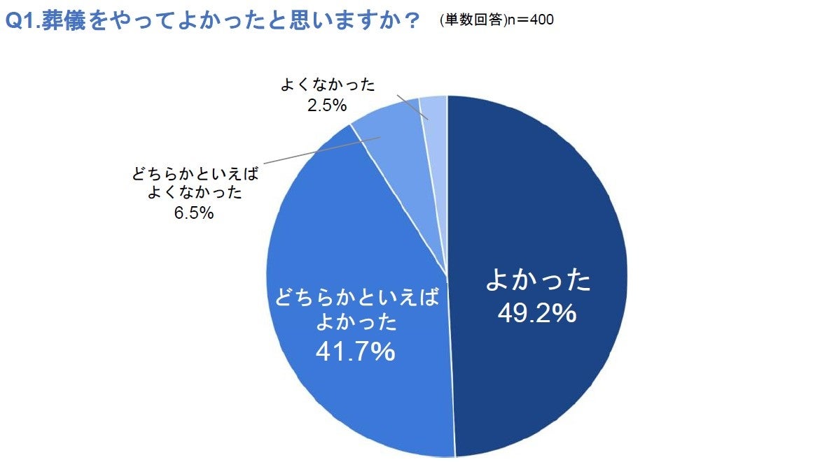 その結果、9割がやってよかった(よかった49.2%、どちらかといえばよかった41.7%)と回答し、全体的に葬儀に関しての満足度は高いことが分かりました。