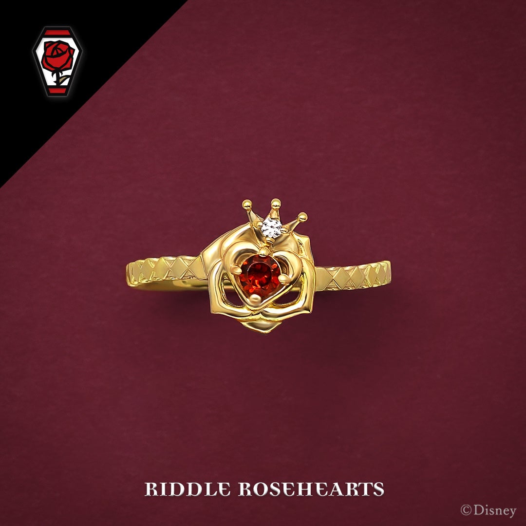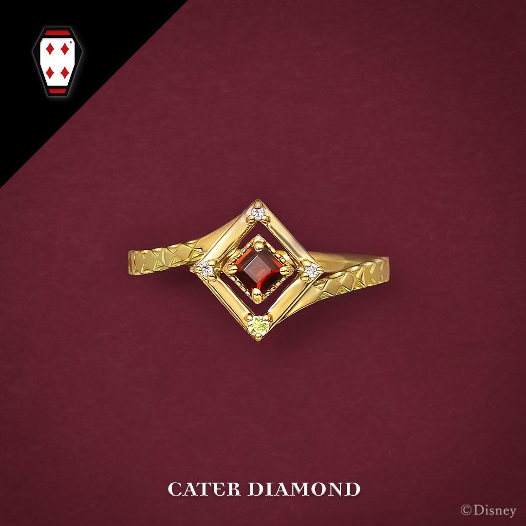 トランプのダイヤで「ケイト・ダイヤモンド」を表現しました。四方を囲う4石のストーンで4(ケイト)を表し、メインストーンにはスクエアのガーネットでケイトらしいカラーリングに仕上げています。正面はチェック柄、側面は王冠風のデザインが施されたアームがハーツラビュル寮らしいデザインです。