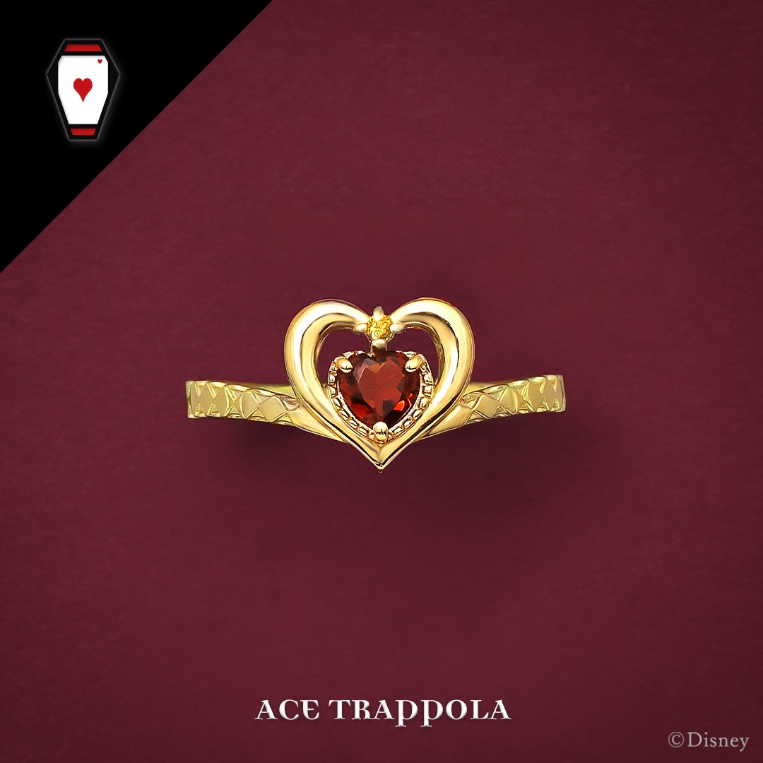 トランプのハートで「エース・トラッポラ」を表現しました。デザイン上部の1石のシトリンが1(エース)を表し、メインストーンは真っ赤なガーネットでエースらしいカラーリングに仕上げています。正面はチェック柄、側面は王冠風のデザインが施されたアームがハーツラビュル寮らしいデザインです。
