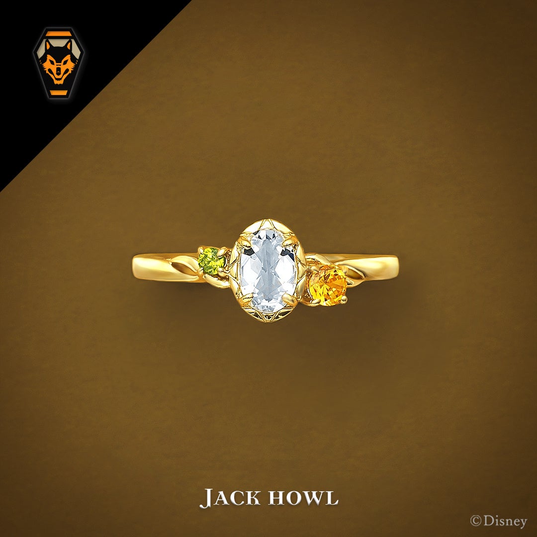 輝くローズカットのホワイトトパーズで、己を磨く「ジャック・ハウル」の姿を表現しました。波線のデザインはトレーニングに励むジャックの疾走感を、2石のカラーストーンは瞳の色と好物の洋ナシのコンポートをイメージしています。アーム側面には寮服をイメージしたパターンを施し、サバナクロー寮らしさをプラスしました。