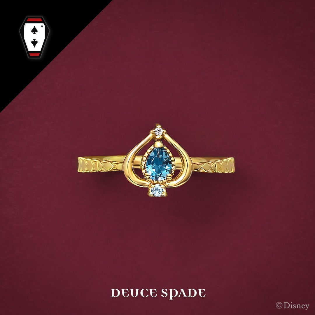 トランプのスペードで「デュース・スペード」を表現しました。デザイン上下の2石のストーンで2(デュース)を表し、メインストーンは深いブルーのロンドンブルートパーズでデュースらしいカラーリングに仕上げています。正面はチェック柄、側面は王冠風のデザインが施されたアームがハーツラビュル寮らしいデザインです。