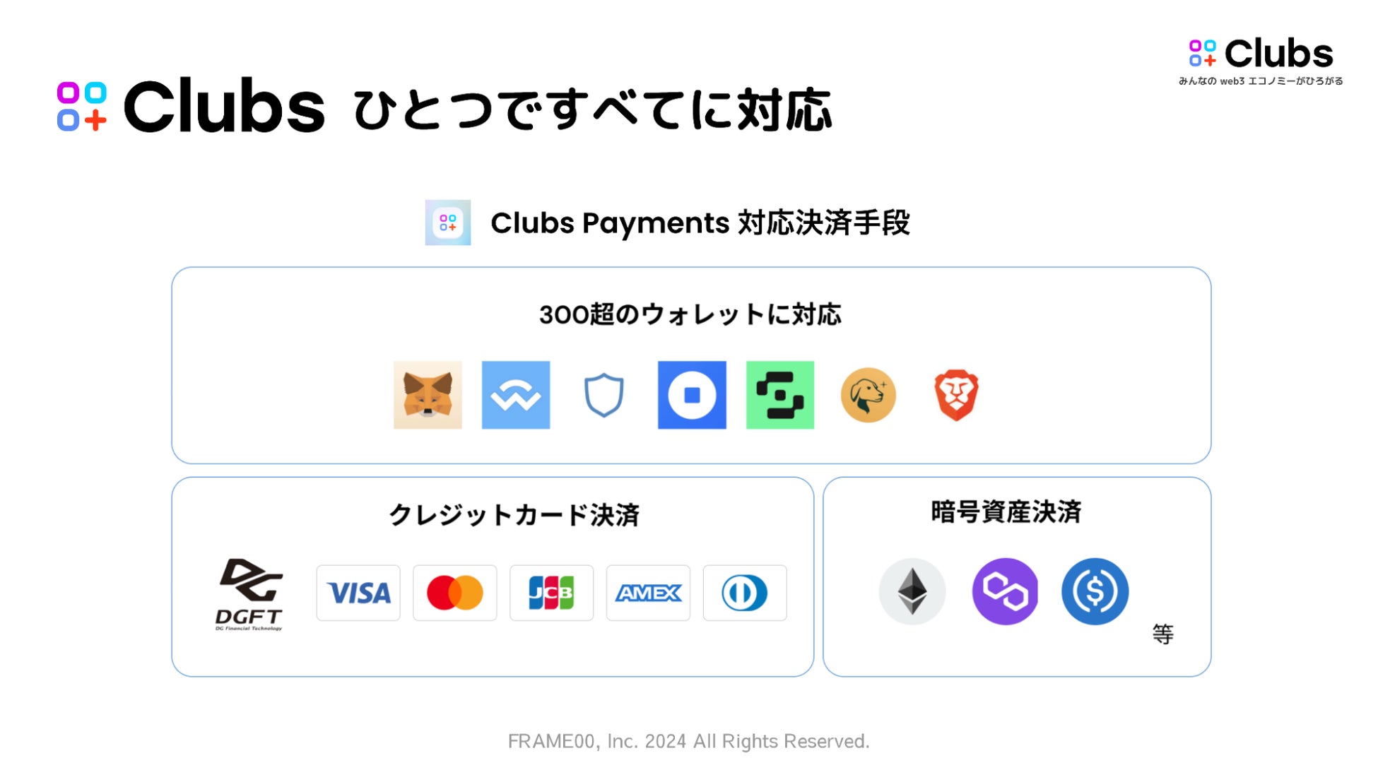 本導入にあたり、Clubs では株式会社DGフィナンシャルテクノロジーが提供するマルチ決済サービス「VeriTrans4G」を採択した「Clubs Payments」を開発。暗号資産での販売に加えて、クレジットカードでの販売および法定通貨での支払い受け取りに対応し、事業者のビジネスニーズに答えました。