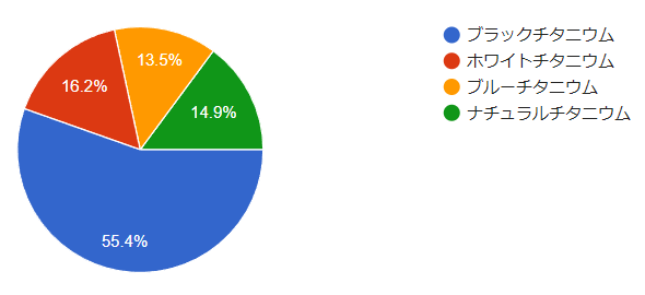 続いて2位がホワイトチタニウムで12名(16.2%)、3位がナチュラルチタニウムで11名(14.9%)、3位がブルーチタニウムで10名(13.5%)です。通常モデルの時とは違い、ブラック以外のカラーもバランスよく購入されています。