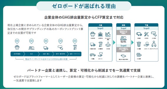 「Zeroboard」は、GHG(温室効果ガス)排出量算定・開示・削減までを支援するソリューションです。国内外のサプライチェーン全体の排出量(Scope 1〜3)、製品別・サービス別の排出量(カーボンフットプリント:CFP)をクラウドで算定・可視化するほか、削減貢献量や水資源などの登録も可能で、各種レポートの出力にも対応しています。算定を入り口として、ユーザー企業の課題に合わせたGHG削減ソリューションを提供することで、企業の脱炭素経営を支援しています。