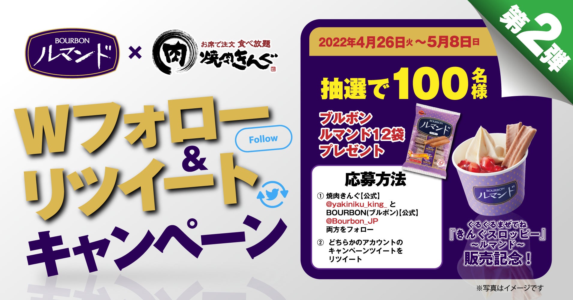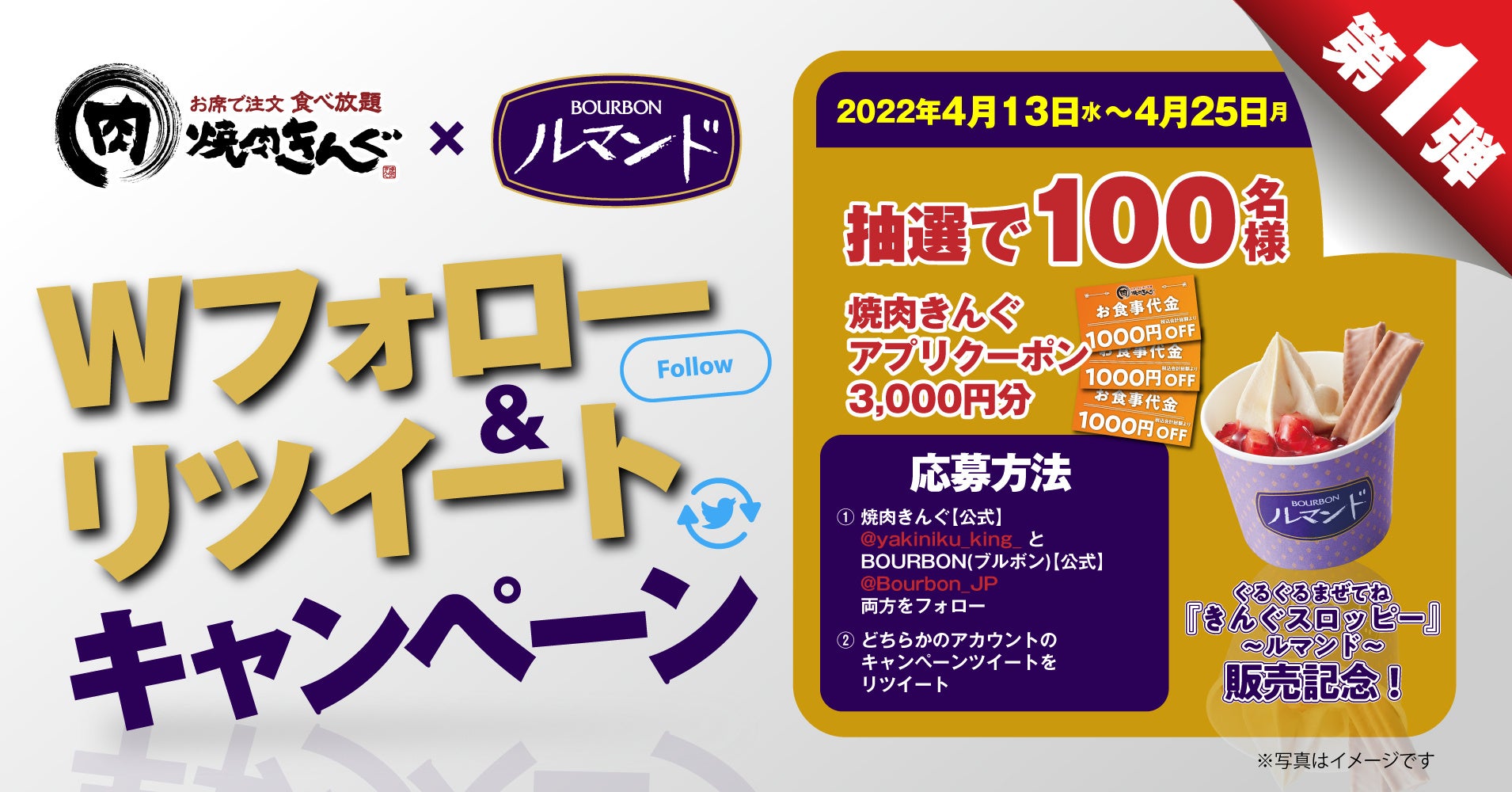 大人気クレープクッキー「ルマンド」とコラボレーションした新デザート「ぐるぐるまぜてね 『きんぐスロッピー 』〜ルマンド〜」の販売を記念して、合計200名様(第1弾・第2弾 各100名様)にプレゼントが当たるWフォロー&リツイートキャンペーンを開催いたします。