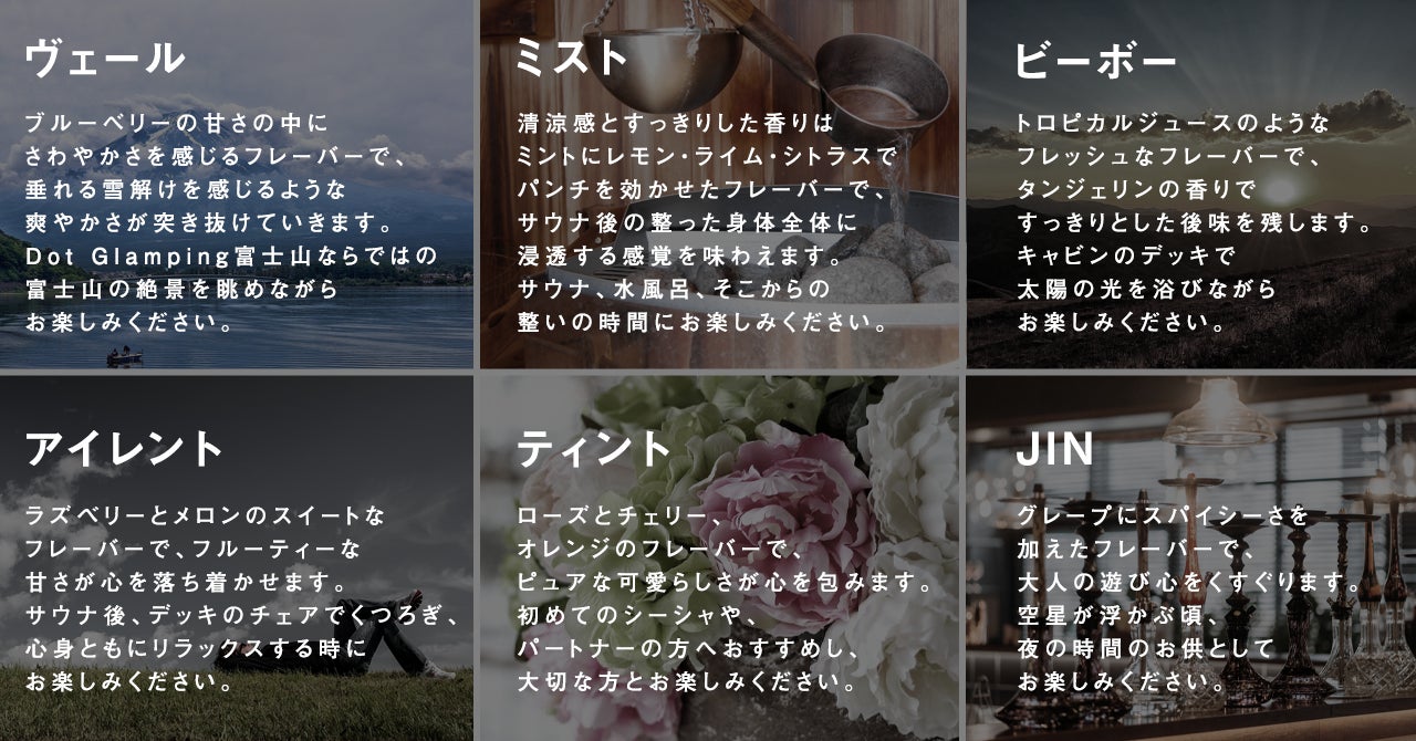 リゾートホテル・グランピング施設の開業支援、運営受託、コンサルティングを行う株式会社Dot Homes(以下、Dot Homes)が運営する山梨県富士河口湖のグランピング施設「Dot Glamping富士山」が、「六本木の隠れ家」として知られる「しーしゃ屋【じん】」とコラボレーションし、オリジナルフレーバー(ノンニコチン/ノンタール)のシーシャを楽しめる期間限定の特別プランを販売いたします。