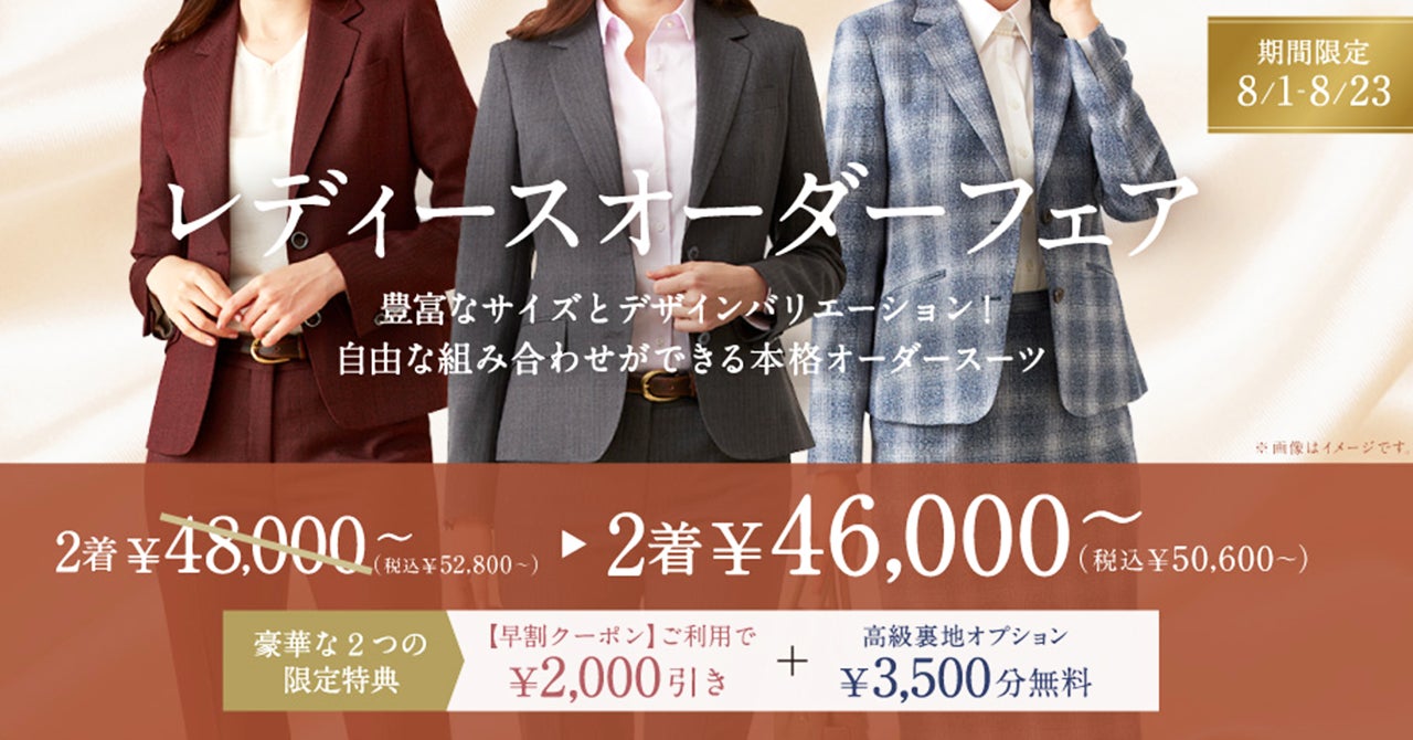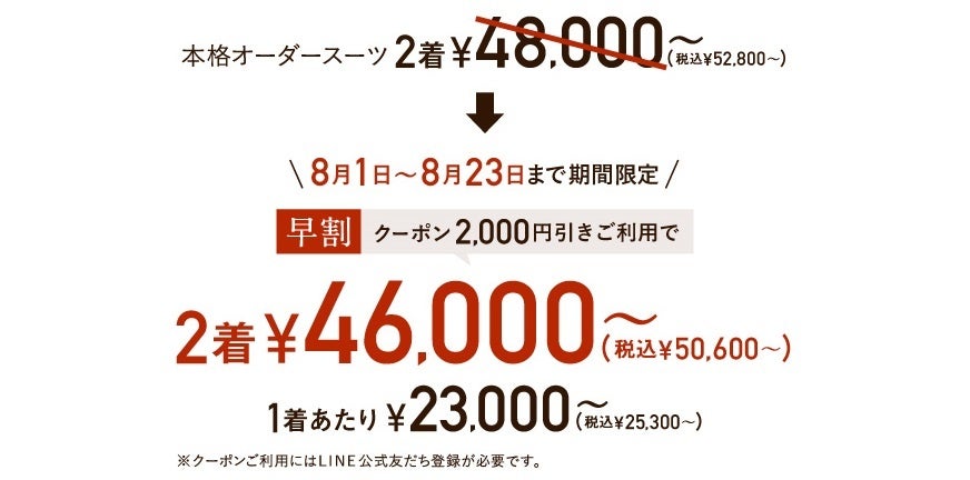 その場で使えるクーポンご利用で本格オーダースーツ2着46,000円~(税込50,600円~)