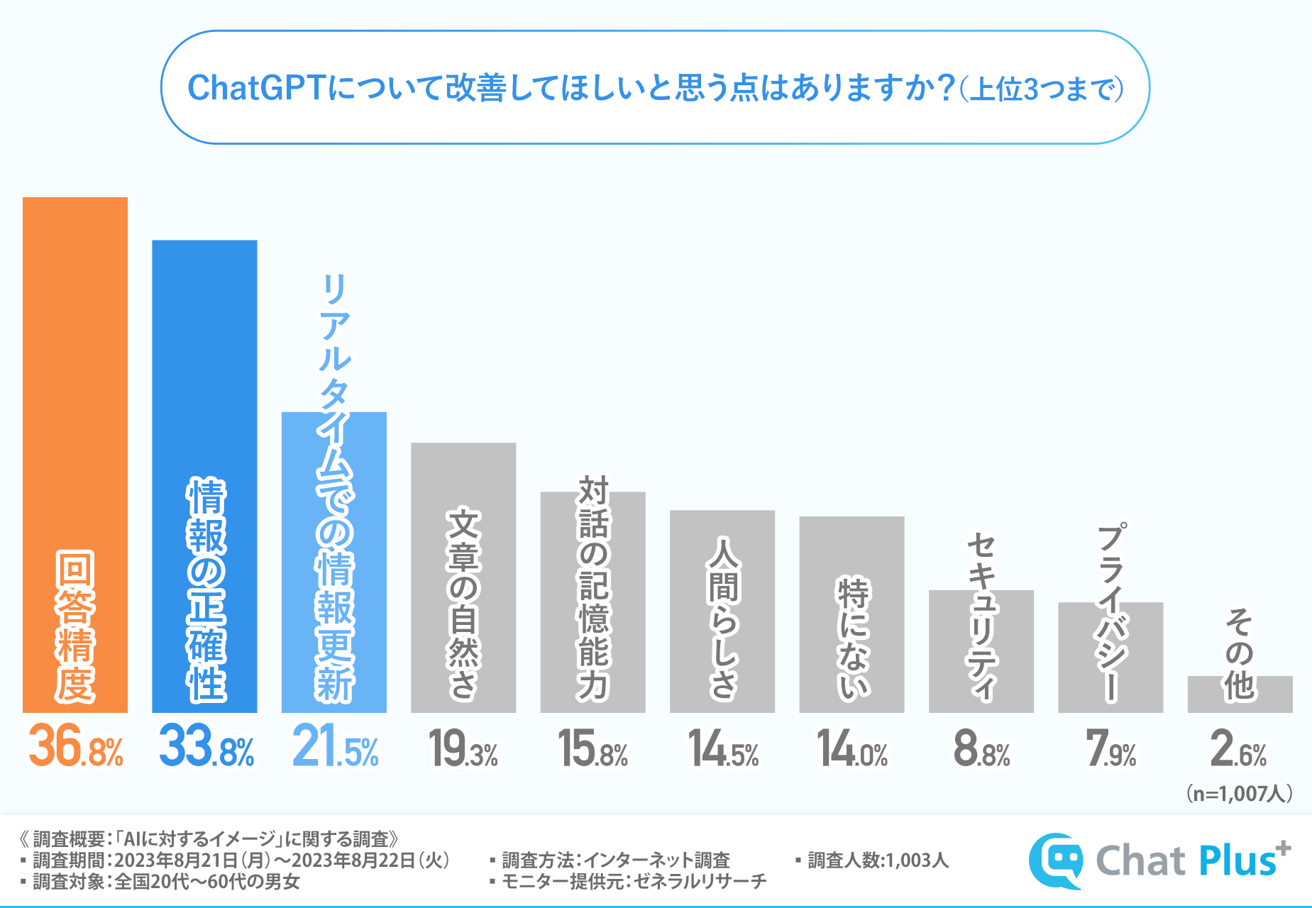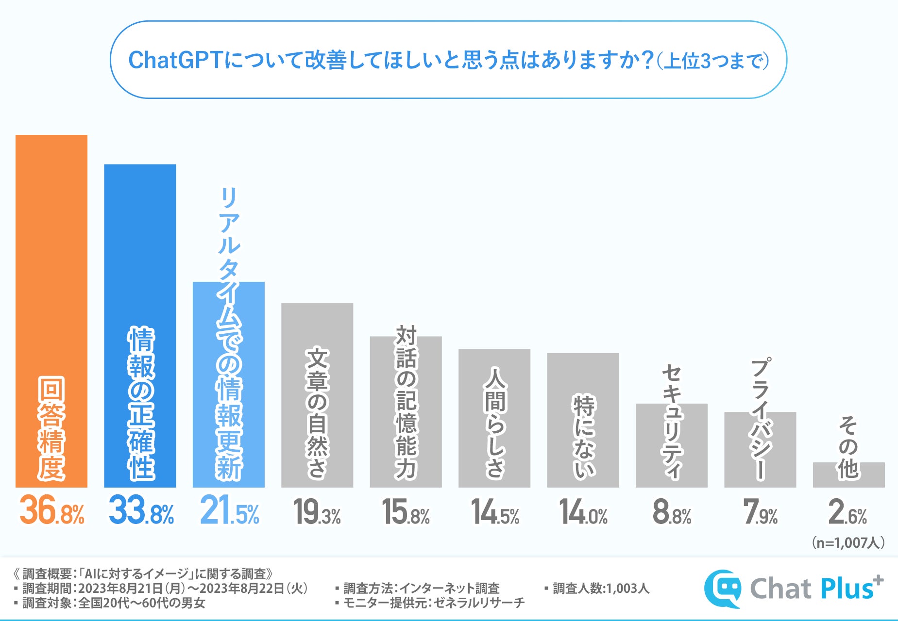 先ほどの調査で、約2割の方がChatGPTを利用したことがあることが分かりましたが、利用していくうえで改善してほしいと思った点はあるのでしょうか?