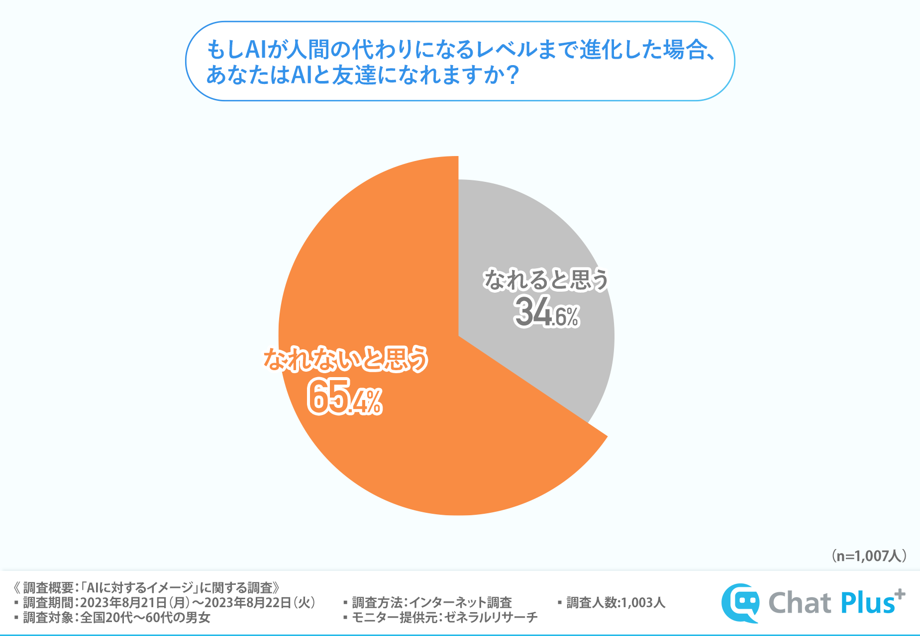 「もしAIが人間の代わりになるレベルまで進化した場合、あなたはAIと友達になれますか?」と質問したところ、7割近くの方が『なれないと思う(65.4%)』と回答しました。
