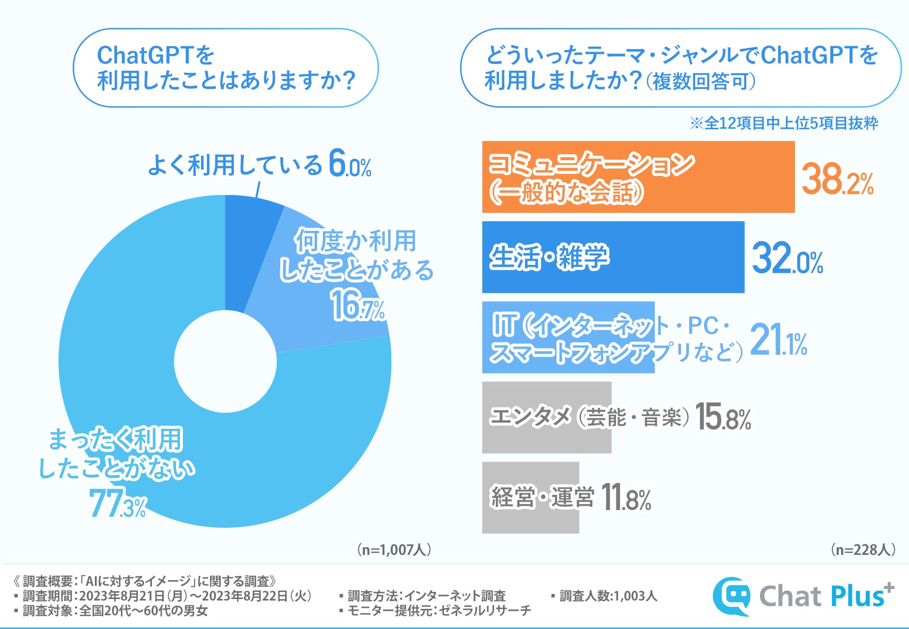 近年AIやChatGPTという言葉をよく聞くようになりましたが、実際に利用したことがある方は全体で約2割とまだまだ少ないようです。